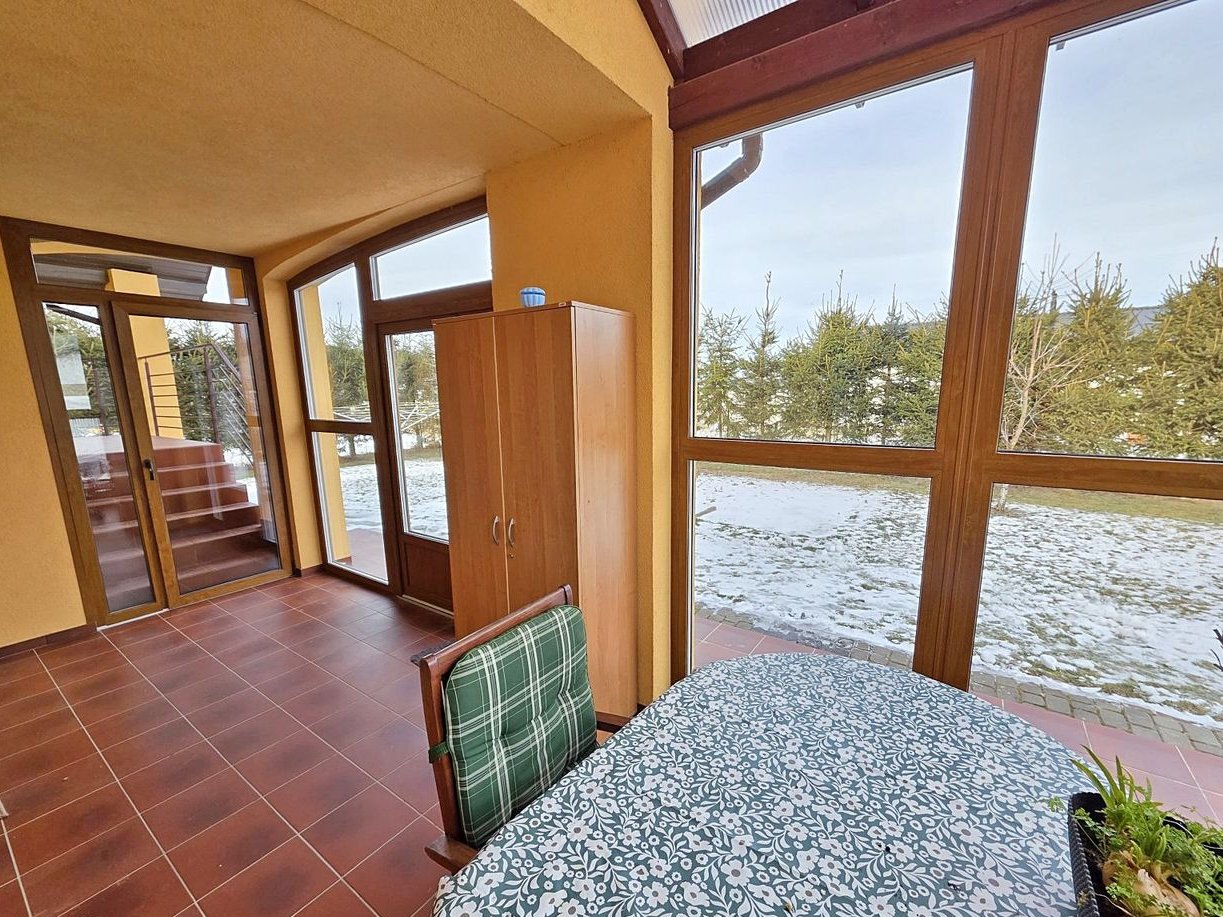 Płynne przejście między wnętrzem, a ogrodem zapewnia atrakcyjna, zabudowana weranda/taras z oknami PCV trzyszybowymi - przestrzeń możliwa do komfortowego użytkowania również w chłodniejsze dni. Podobne rozwiązanie zastosowano przy wejściu do domu, gdzie zabudowana wnęka stworzyła praktyczny wiatrołap/hol z miejscem na pojemną zabudowę.