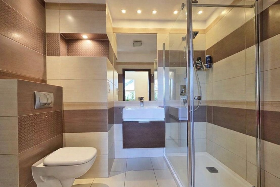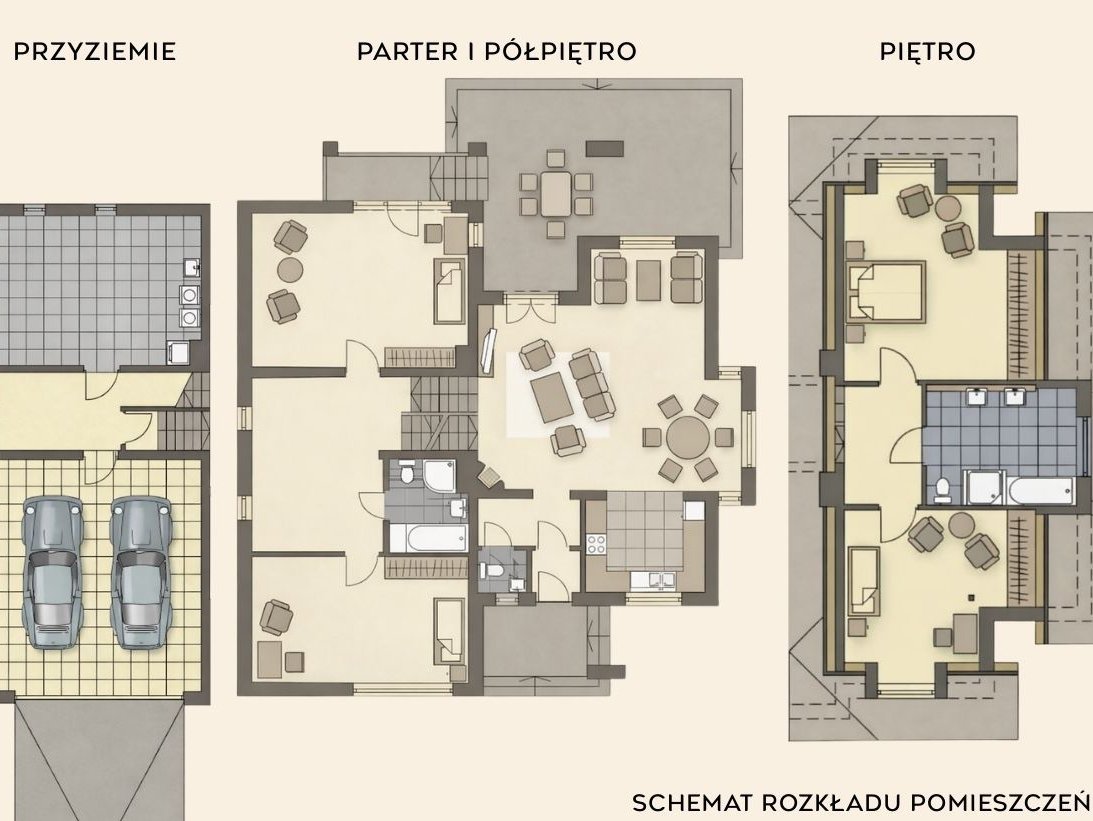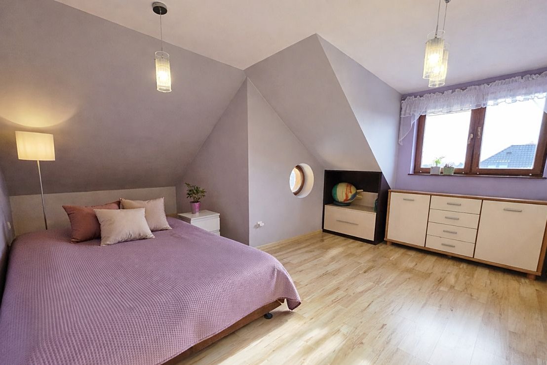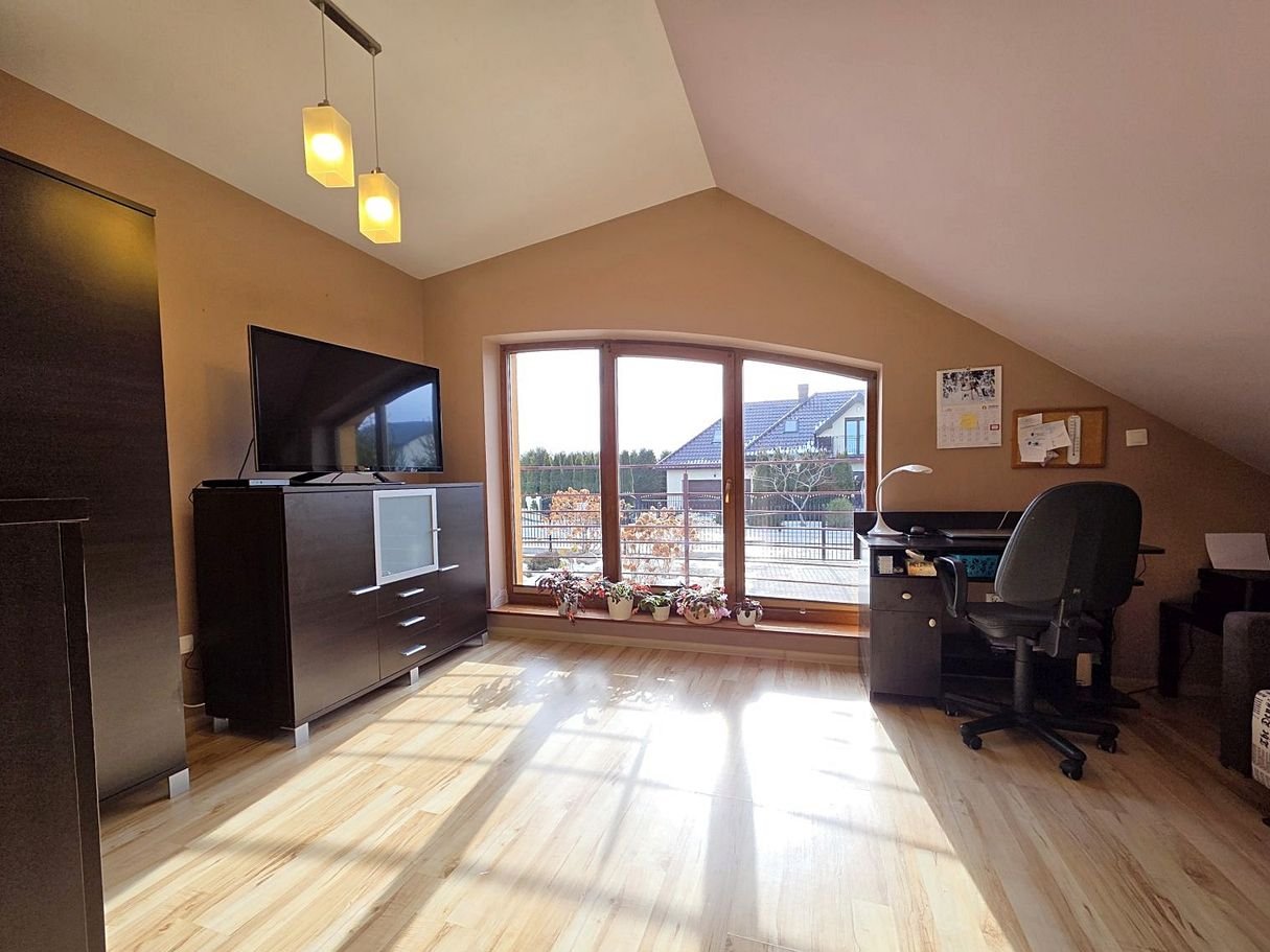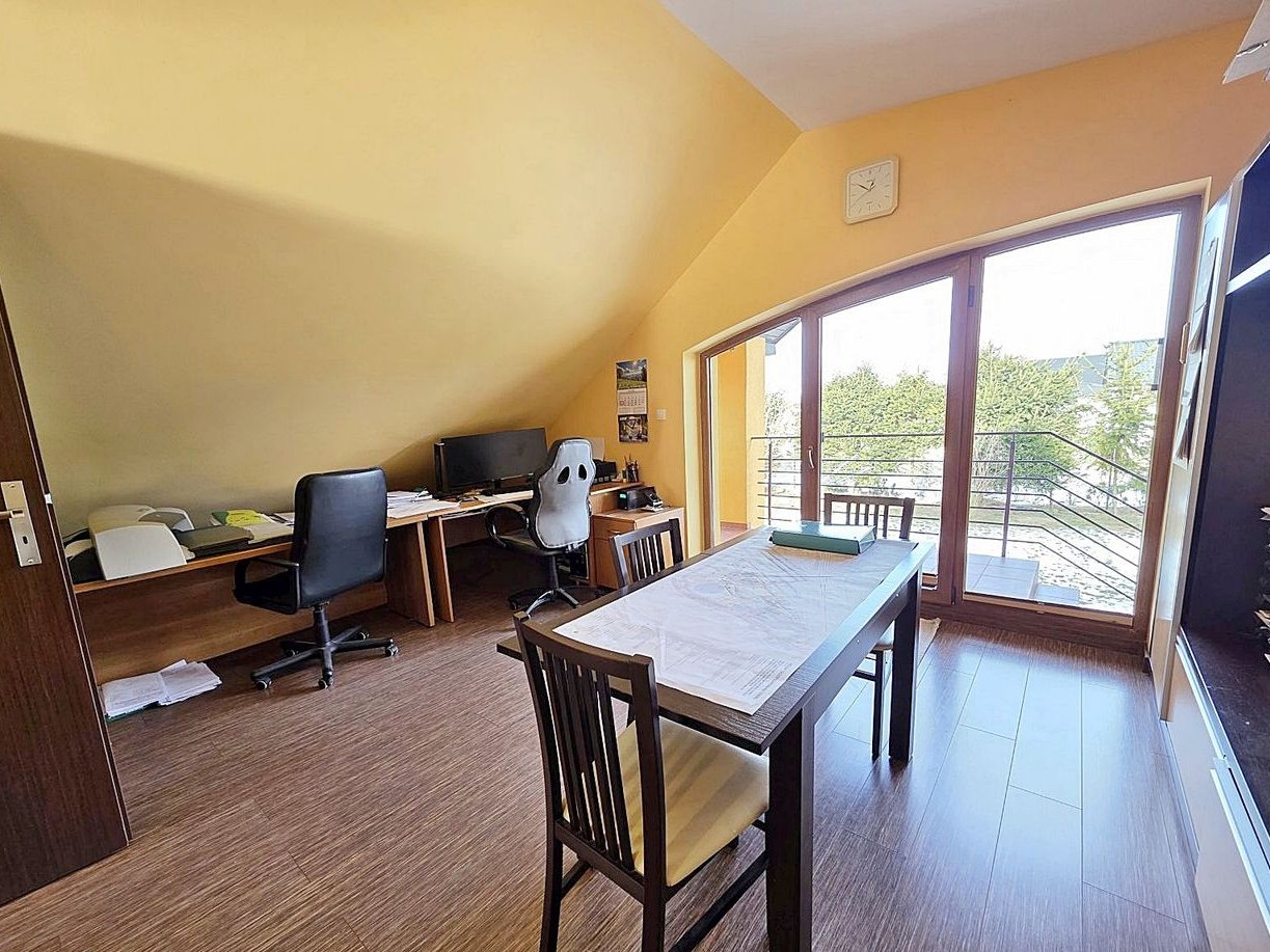 Dużym atutem jest półpiętro, na którym znajdują się pierwsze sypialnie z dużymi panoramicznymi oknami oraz łazienka z prysznicem. Z jednego z pokoi prowadzi balkon z zejściem do ogrodu - to rozwiązanie szczególnie docenią osoby planujące gabinet, biuro lub niezależną przestrzeń do pracy z wygodnym dostępem z zewnątrz.