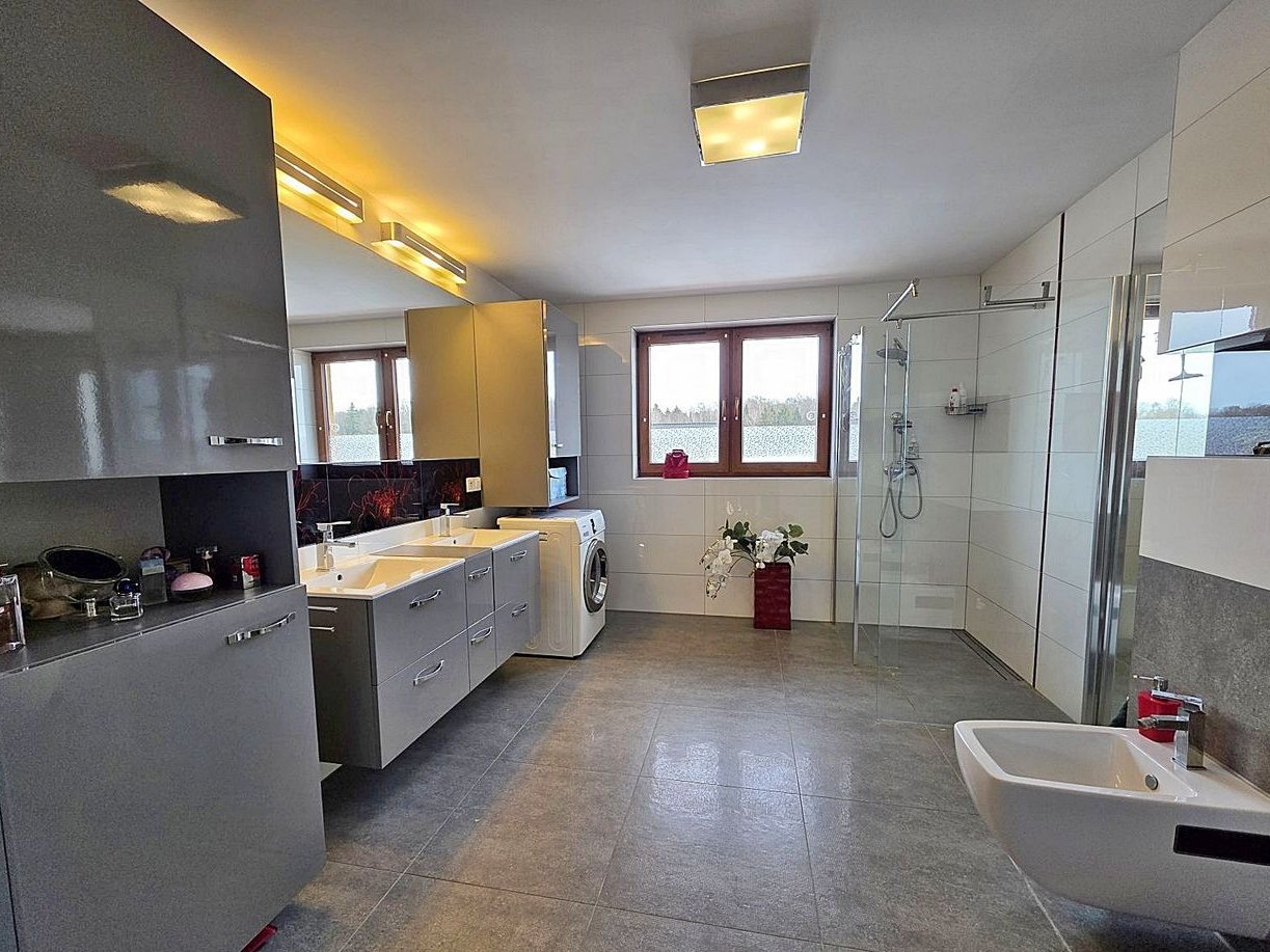 Dom jest częściowo podpiwniczony, co znacząco zwiększa jego funkcjonalność. W bryle znajduje się także duży, dwustanowiskowy garaż, z automatyczną bramą wjazdową.