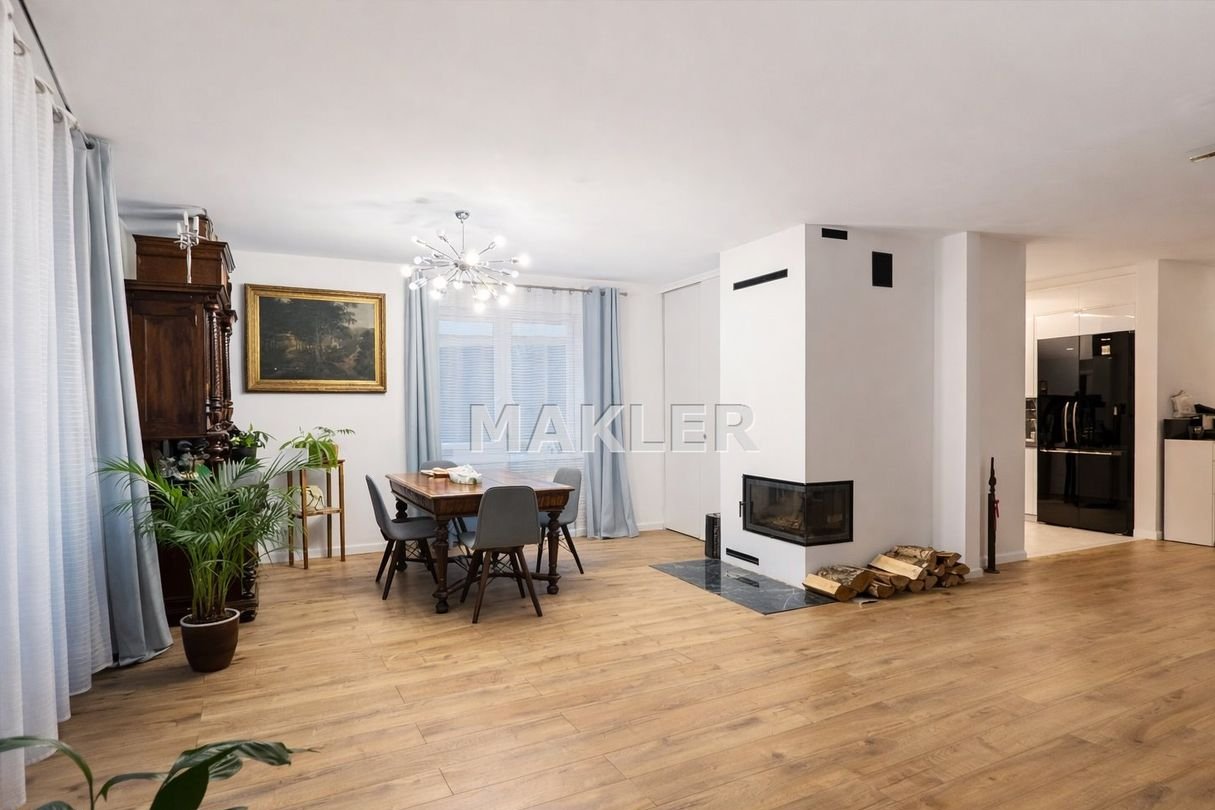 Salon jest doskonale doświetlony, a kominek tworzy wyjątkową atmosferę i zapewnia dodatkowe źródło ciepła w chłodniejsze dni. Piętro;