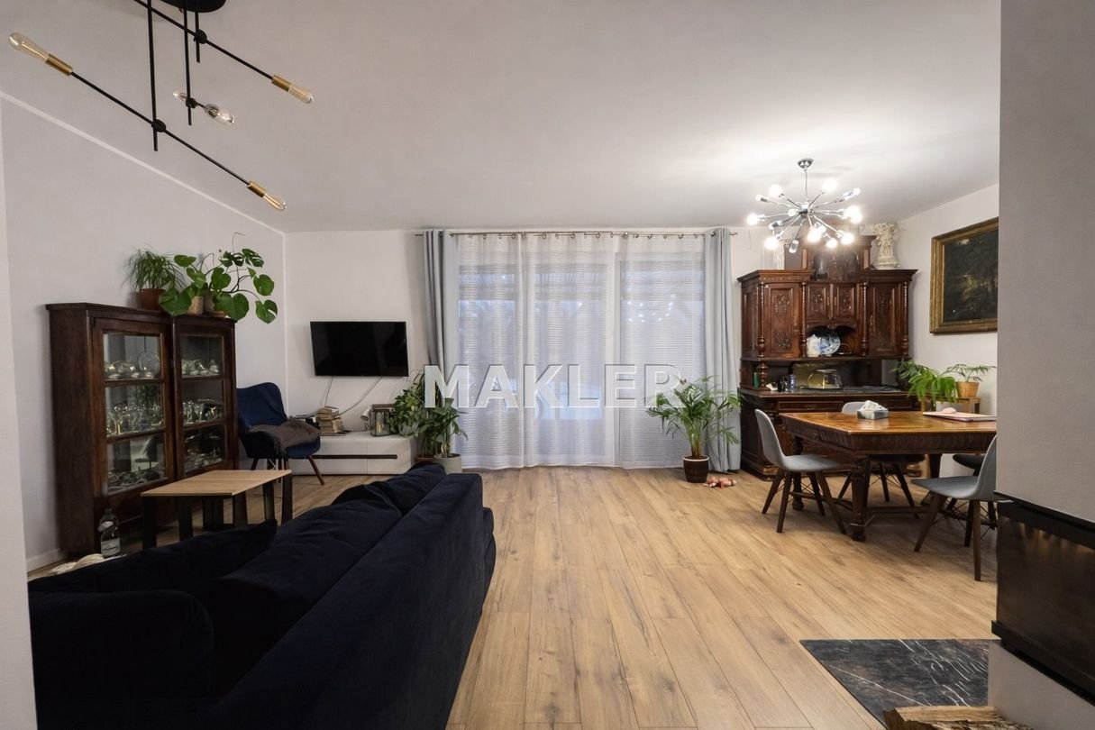 Duży, jasny salon z kominkiem i wyjściem na taras oraz ogród