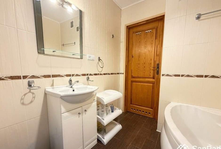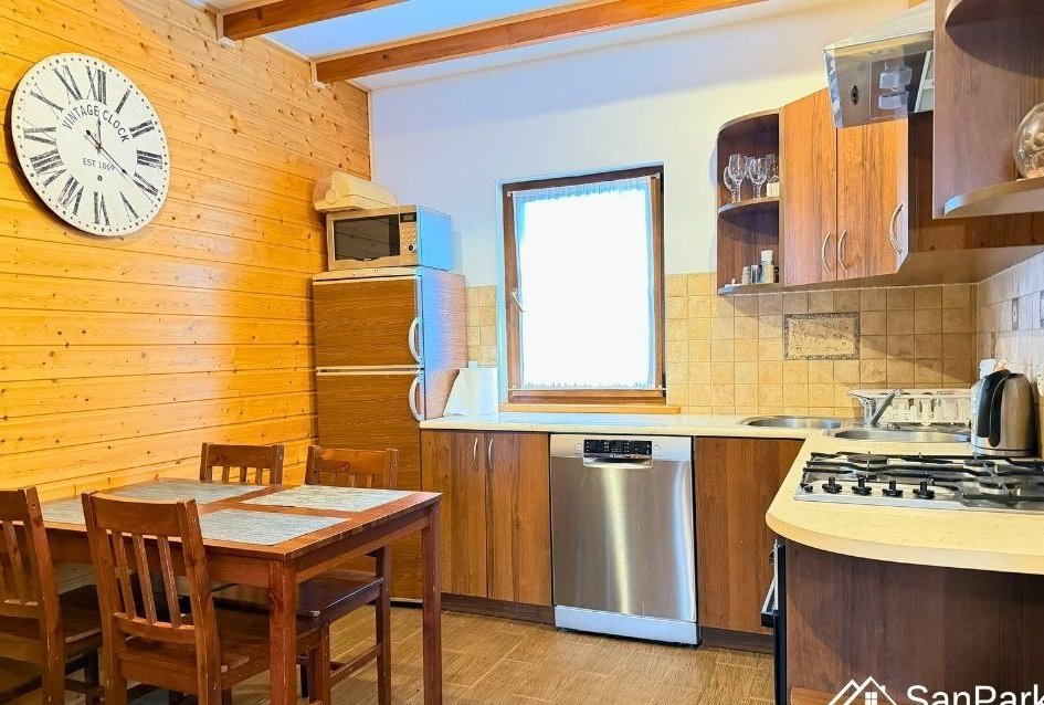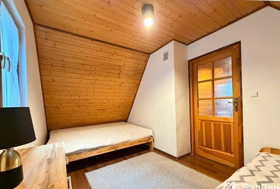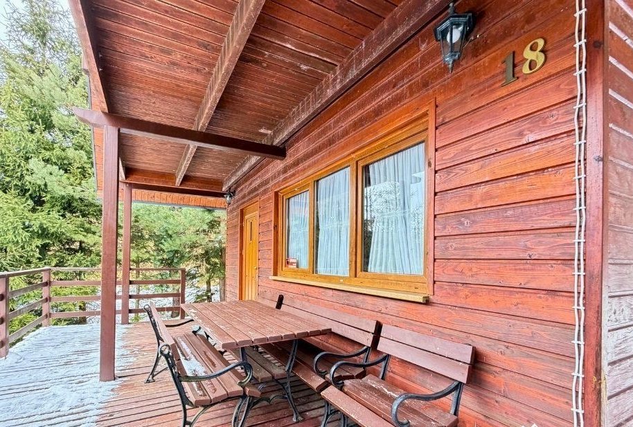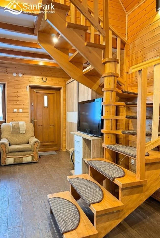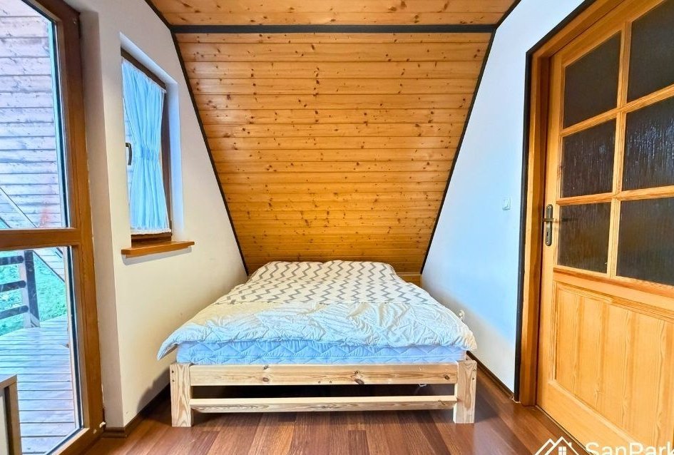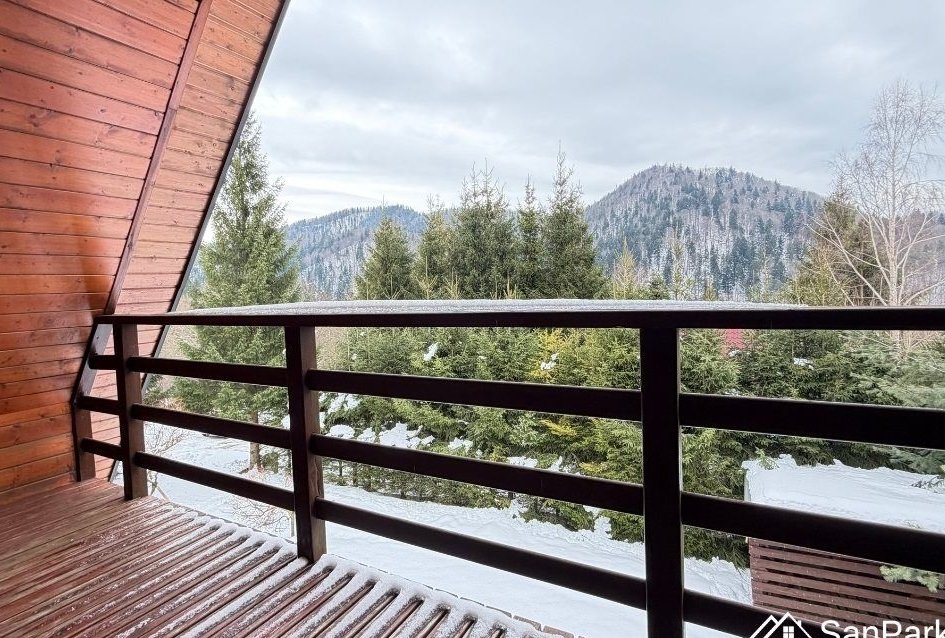 Dom jest parterowy z użytkowym poddaszem, wykonany z drewna, co nadaje mu wyjątkowy, naturalny charakter i zapewnia przyjazny mikroklimat wnętrz. Na parterze znajduje się jasny salon, kuchnia, łazienka oraz zadaszony taras, idealny do porannej kawy lub wieczornego wypoczynku. Z tarasu rozpościera się piękny, widok na okoliczne wzgórza i lasy, który gwarantuje ciszę i prywatność. Poddasze użytkowe obejmuje dwie sypialnie, przedpokój oraz balkon, z którego można podziwiać bieszczadzką panoramę.
