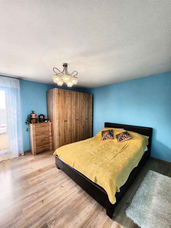 Komfortowej sypialni z bezpośrednim wyjściem na duży taras, idealny do relaksu na świeżym powietrzu.