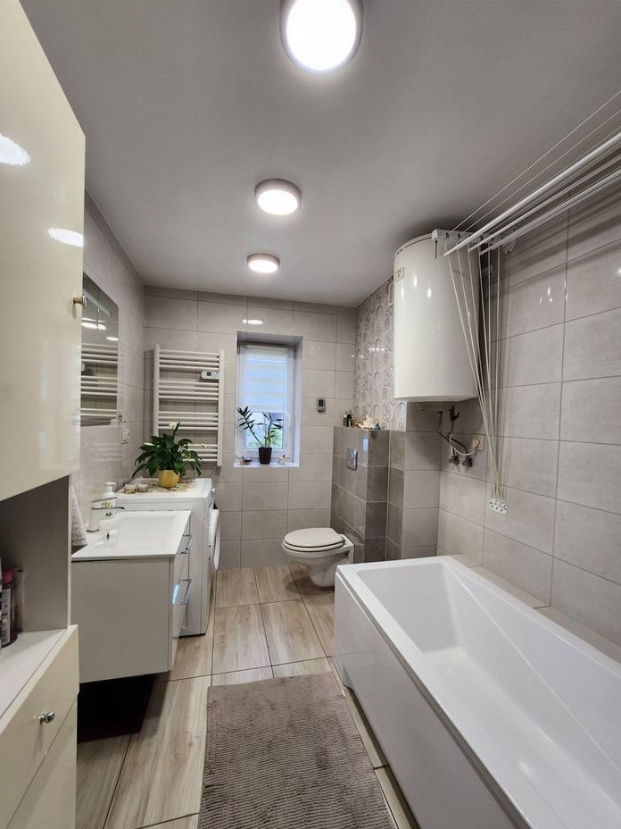Łazienki wyposażone w wannę, umywalkę, WC oraz pralkę
