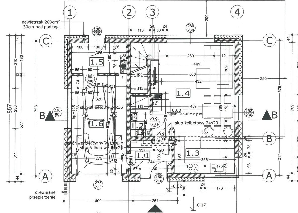 Wentylacja: grawitacyjna w kotłowni i garażu, wentylacja mechaniczna (rekuperacja z odzyskiem ciepła) w pozostałej części domu.