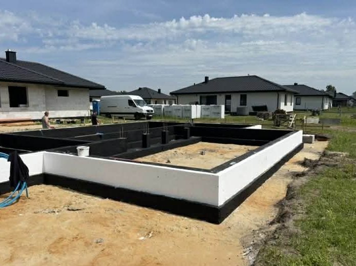 Budynek ocieplony styropianem grafitowym o grubości 20 cm.