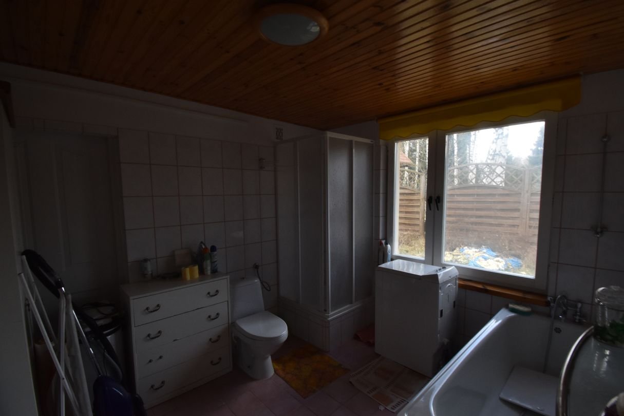 Na działce o powierzchni 475m² znajduje się również druga, zewnętrzna łazienka wyposażona w toaletę, a także miejsce na ognisko i przestrzeń do rekreacji.