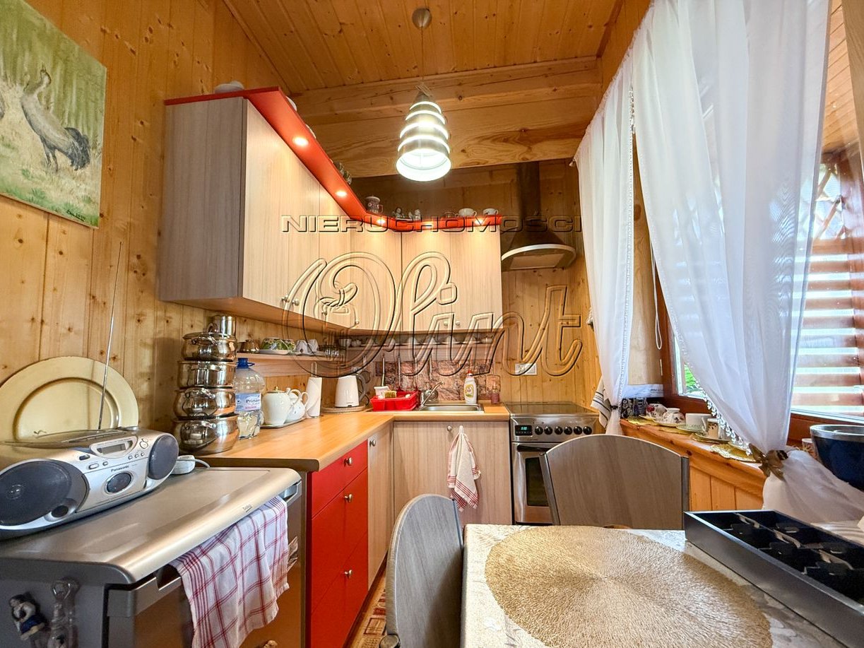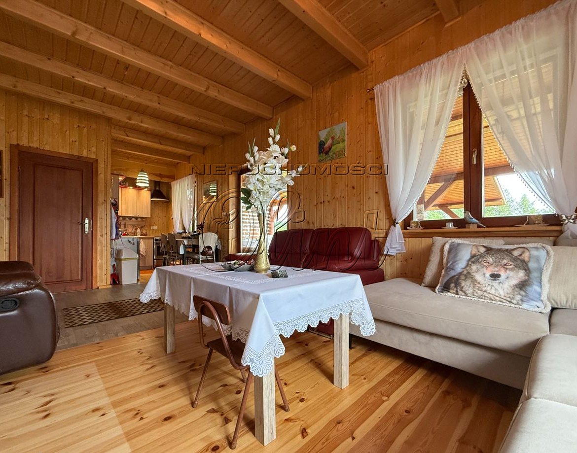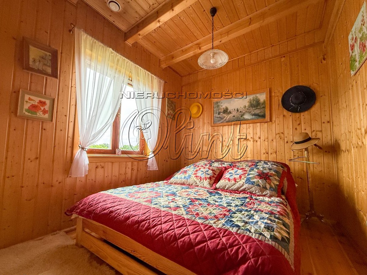 Dom drewniany (całoroczny ze świerka szwedzkiego) z 2020r. o powierzchni użytkowej na parterze 51,40 m2 (dwa pokoje, salon z aneksem kuchennym oraz łazienka z wc i przedpokojem. Na poddaszu kolejne ok. 50 m2 do indywidualnej aranżacji ze schodami wyciąganymi. Dom jest w pełni wyposażony. Drewniane akcenty i naturalne materiały podkreślają sielski, ale wyrafinowany charakter wnętrza.