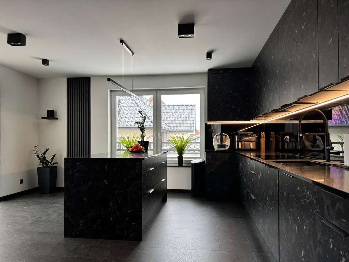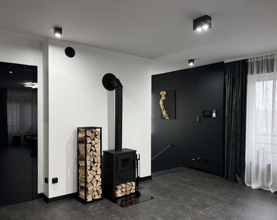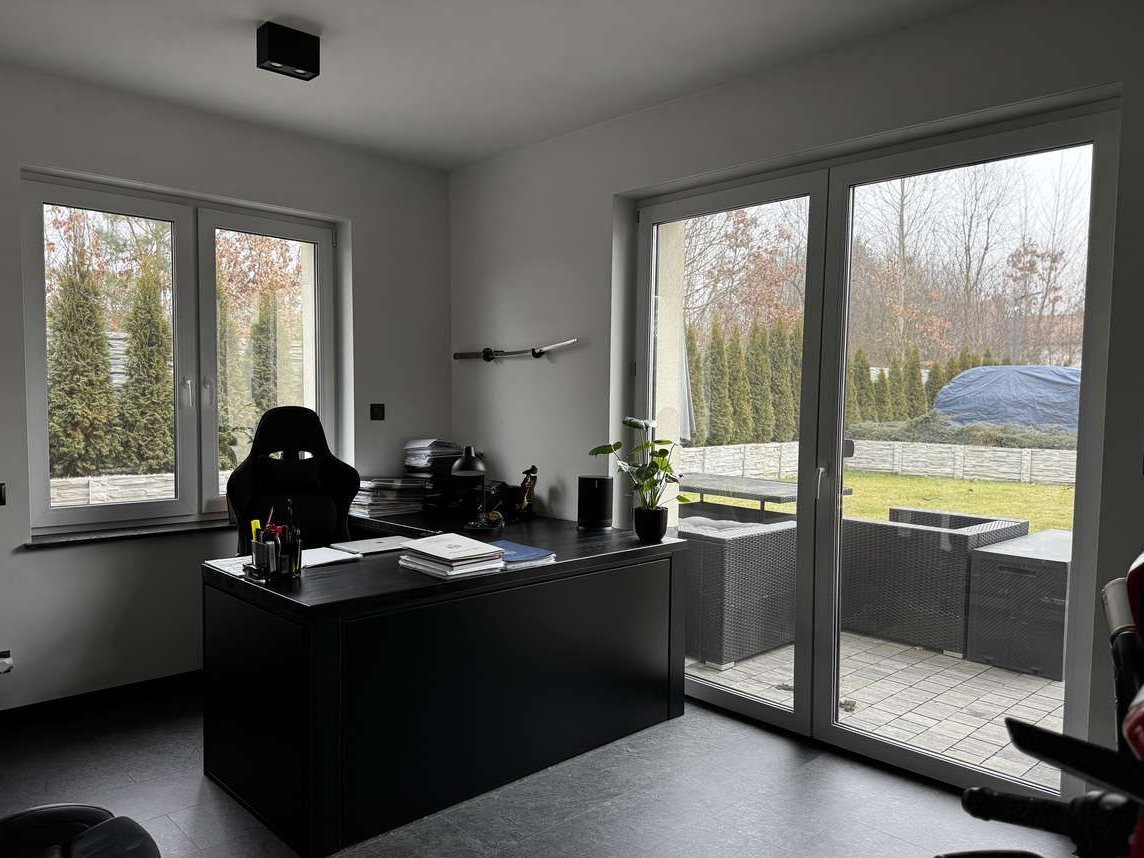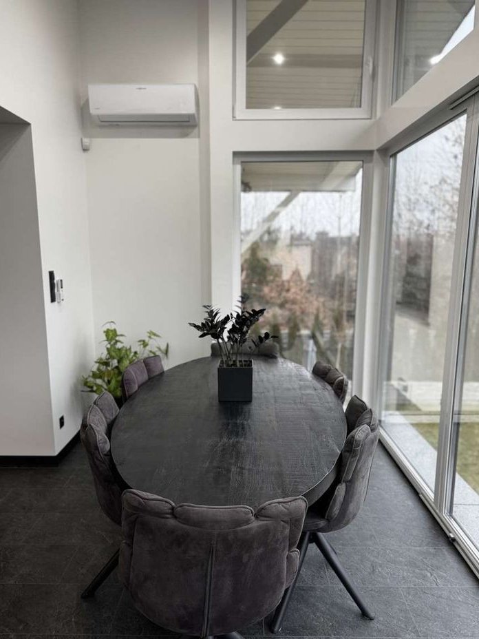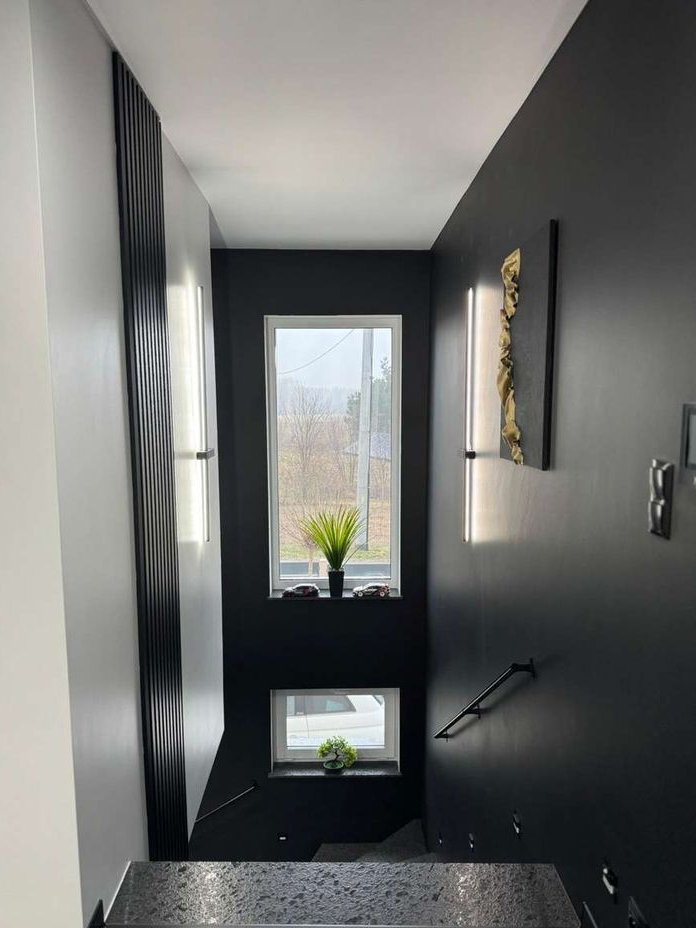 Dom został wykończony z dbałością o każdy szczegół i przy użyciu materiałów wysokiej klasy. Panele winylowe w głębokiej czerni, kamienne schody, parapety i blaty, drzwi bezprzylgowe w połysku – każdy element świadczy o solidności i starannym wykonaniu. Nie ma tu miejsca na kompromisy czy oszczędności kosztem jakości. Pompa ciepła Viessmann, dwie klimatyzacje, rolety antywłamaniowe oraz system kamer zapewniają codzienny komfort i bezpieczeństwo.