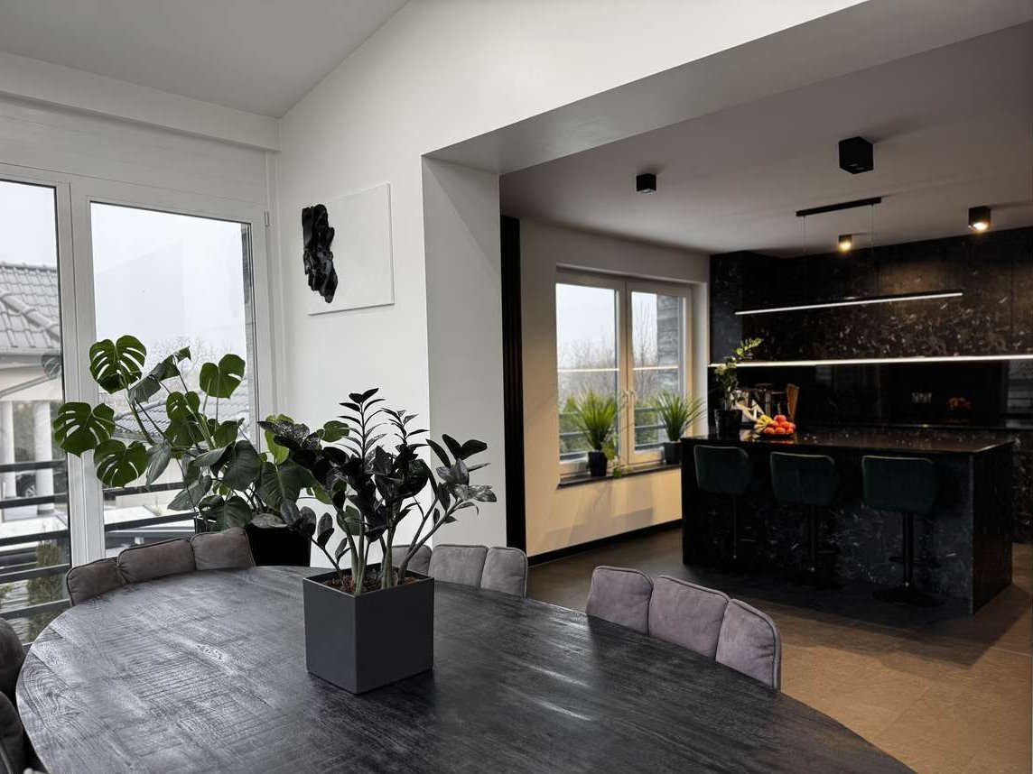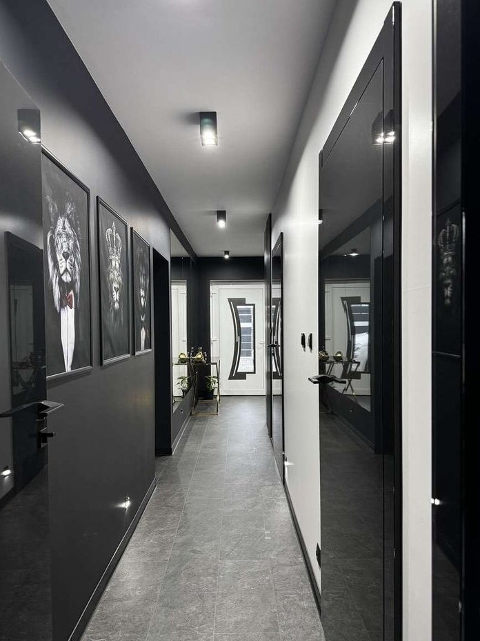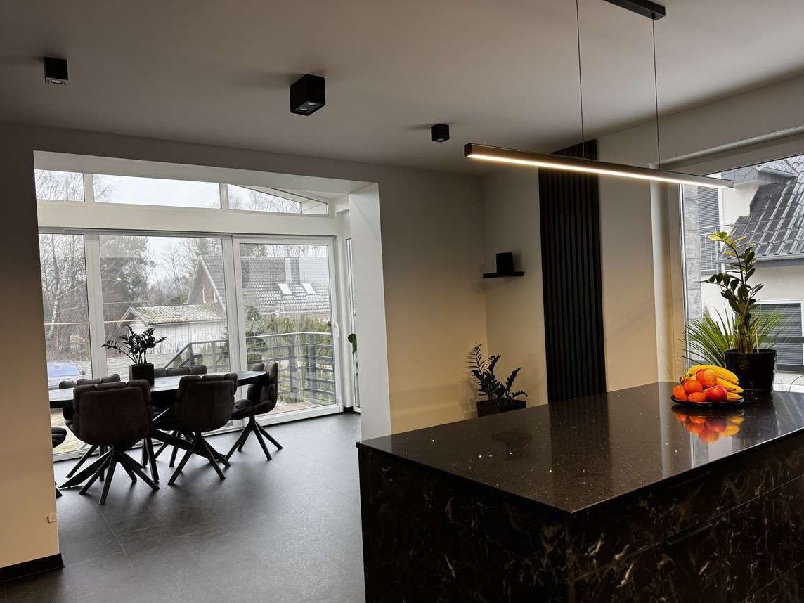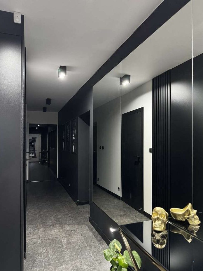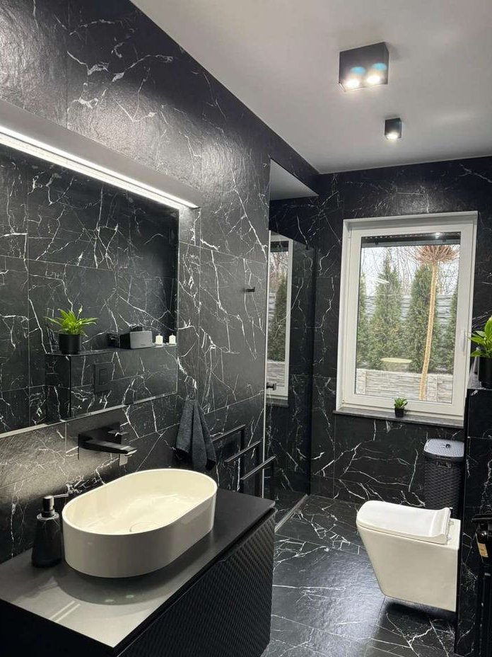 Dom został wykończony z dbałością o każdy szczegół i przy użyciu materiałów wysokiej klasy. Panele winylowe w głębokiej czerni, kamienne schody, parapety i blaty, drzwi bezprzylgowe w połysku – każdy element świadczy o solidności i starannym wykonaniu. Nie ma tu miejsca na kompromisy czy oszczędności kosztem jakości. Pompa ciepła Viessmann, dwie klimatyzacje, rolety antywłamaniowe oraz system kamer zapewniają codzienny komfort i bezpieczeństwo.