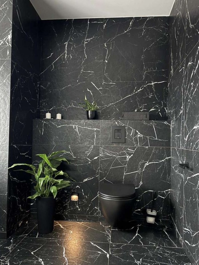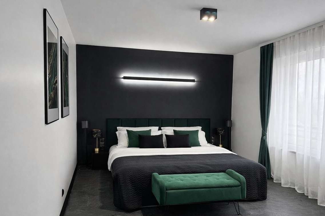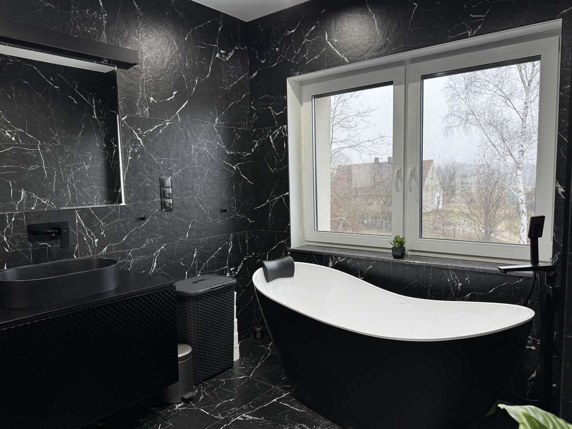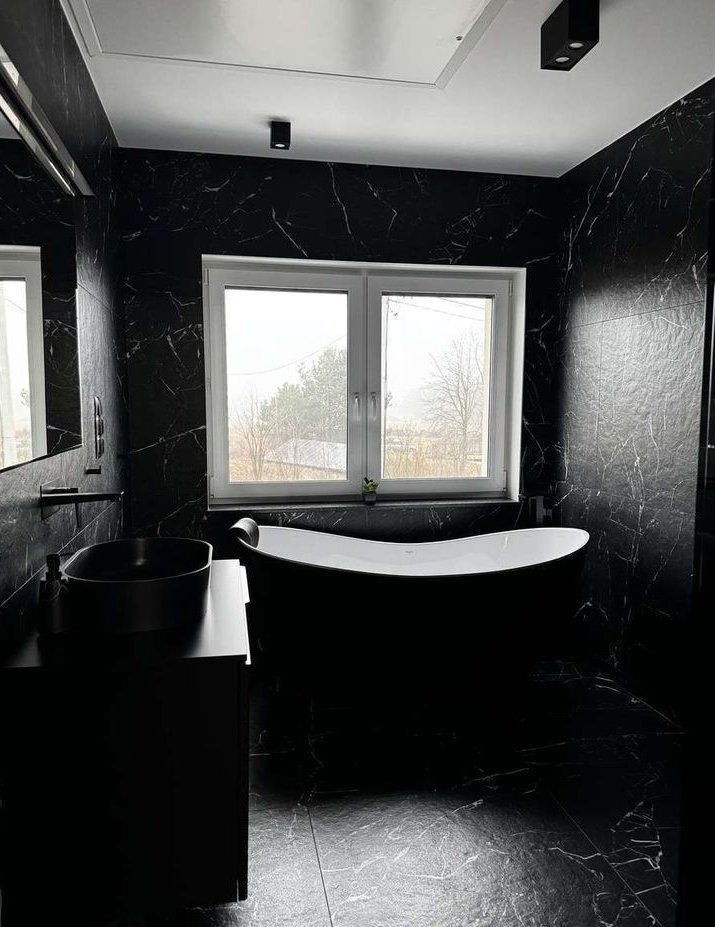 Na piętrze znajduje się także elegancka sypialnia i wyjątkowa łazienka z wolnostojącą wanną. Czarna ceramika i wysmakowane wykończenia sprawiają, że ta przestrzeń jest nie tylko praktyczna, ale i niezwykle luksusowa.