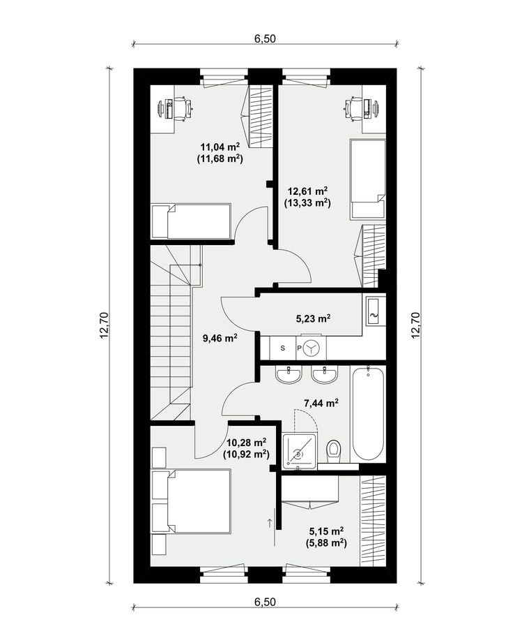 Piętro to strefa prywatna, w której znajdują się trzy przestronne pokoje. Główna sypialnia została wyposażona w garderobę, zapewniającą wygodę przechowywania. Dwa dodatkowe pokoje mogą pełnić funkcję sypialni, gabinetu lub pokoju dziecięcego. Na tej kondygnacji znajduje się również duża łazienka oraz pralnia, co podnosi komfort codziennego użytkowania.