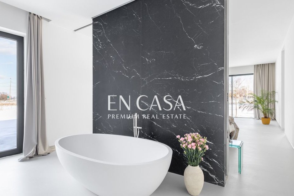 The house was built in 2010 and thoroughly renovated in 2022. All windows were replaced with spectacular aluminum Alu Prof MB-Skyline windows—panoramic, threshold-free, floor-to-ceiling, and burglar-resistant glass. They guarantee maximum interior light . Underfloor heating is installed throughout the house, ensuring comfort and aesthetics without visible radiators.