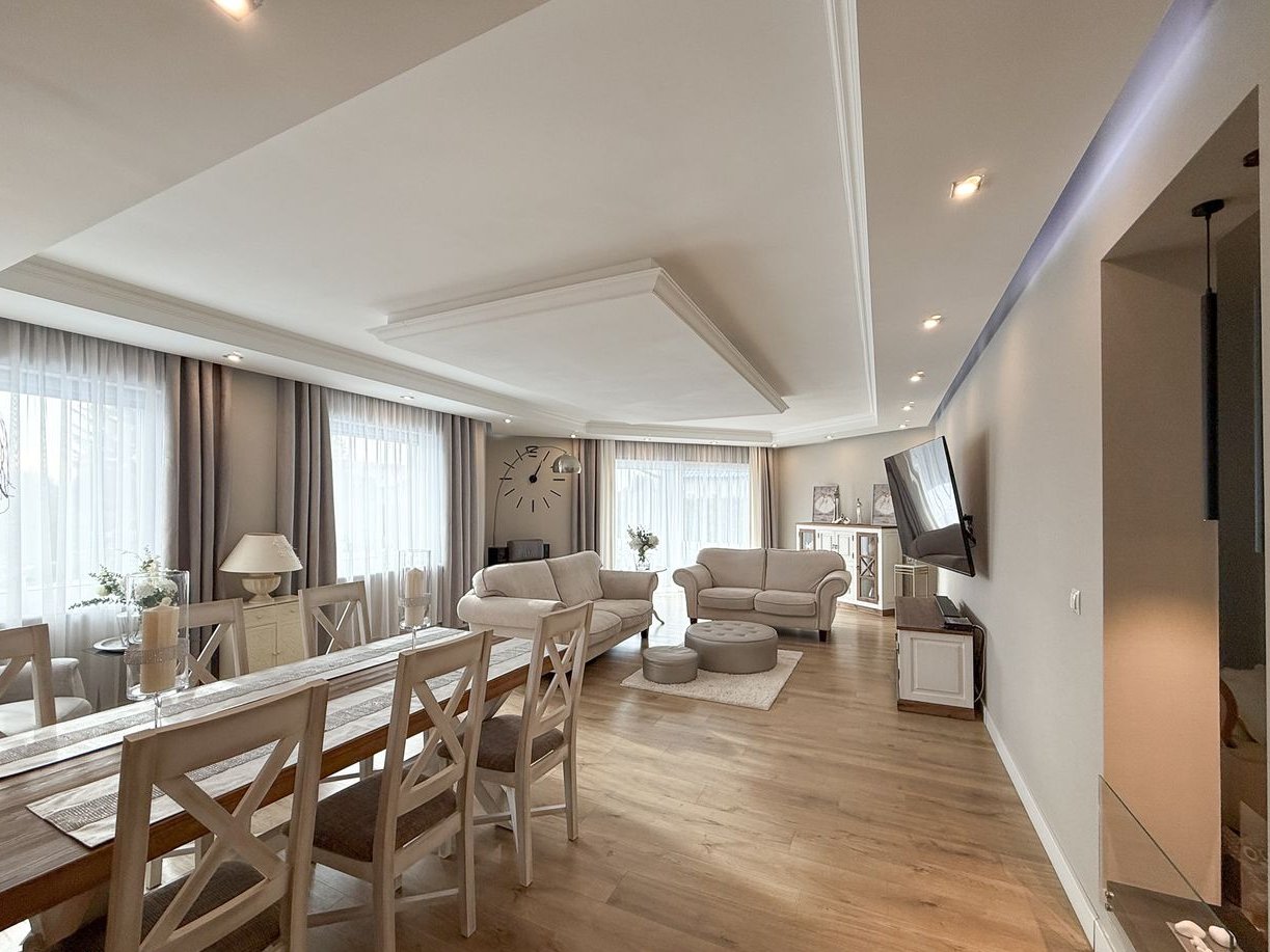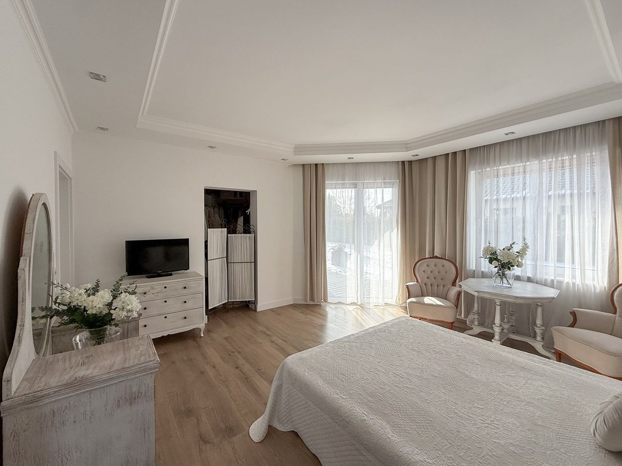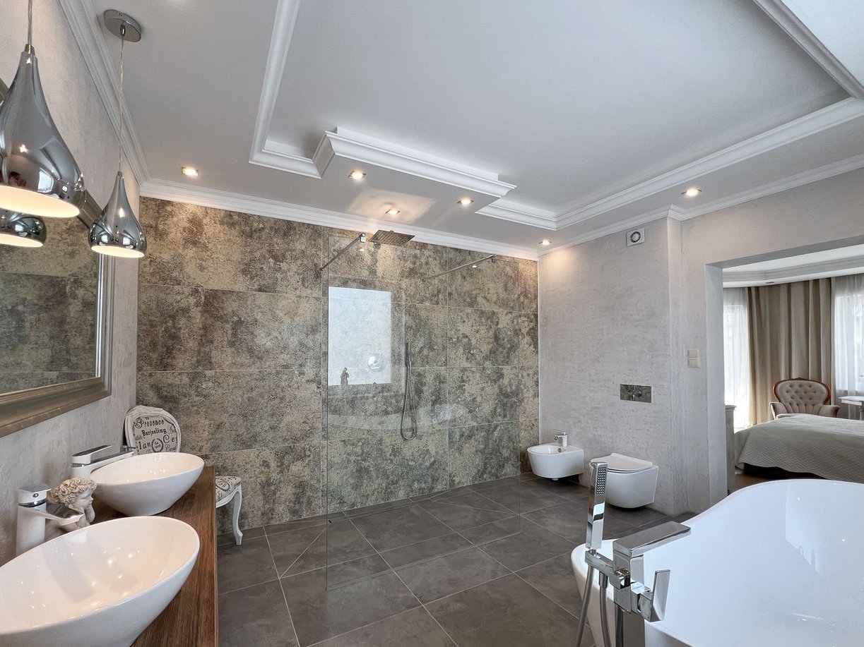 Trzy ustawne sypialnie, w tym wyjątkowa strefa właścicieli obejmująca sypialnię z prywatnym wyjściem na taras, garderobę oraz przestronny salon kąpielowy z wanną wolnostojącą, przeszkloną kabiną prysznicową z odpływem liniowym oraz podwójną umywalką.