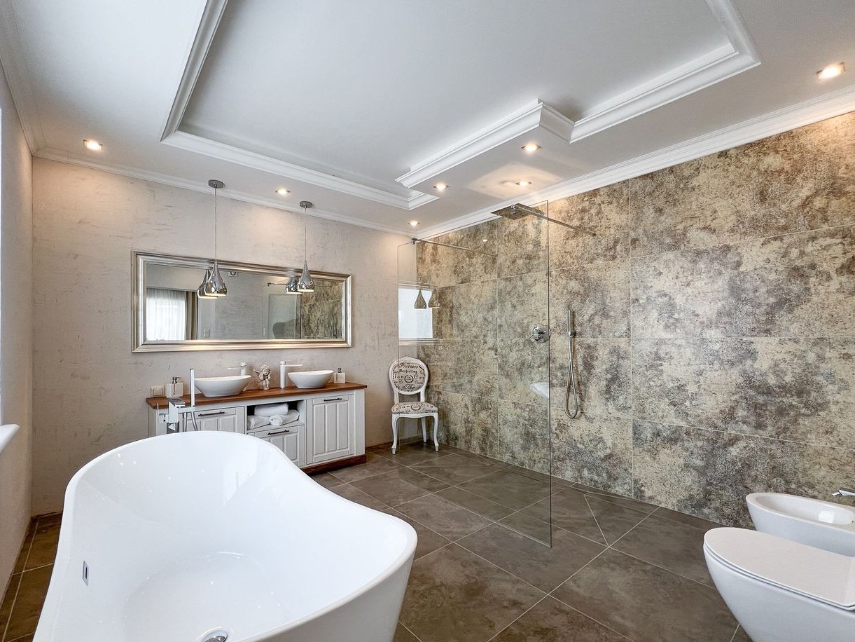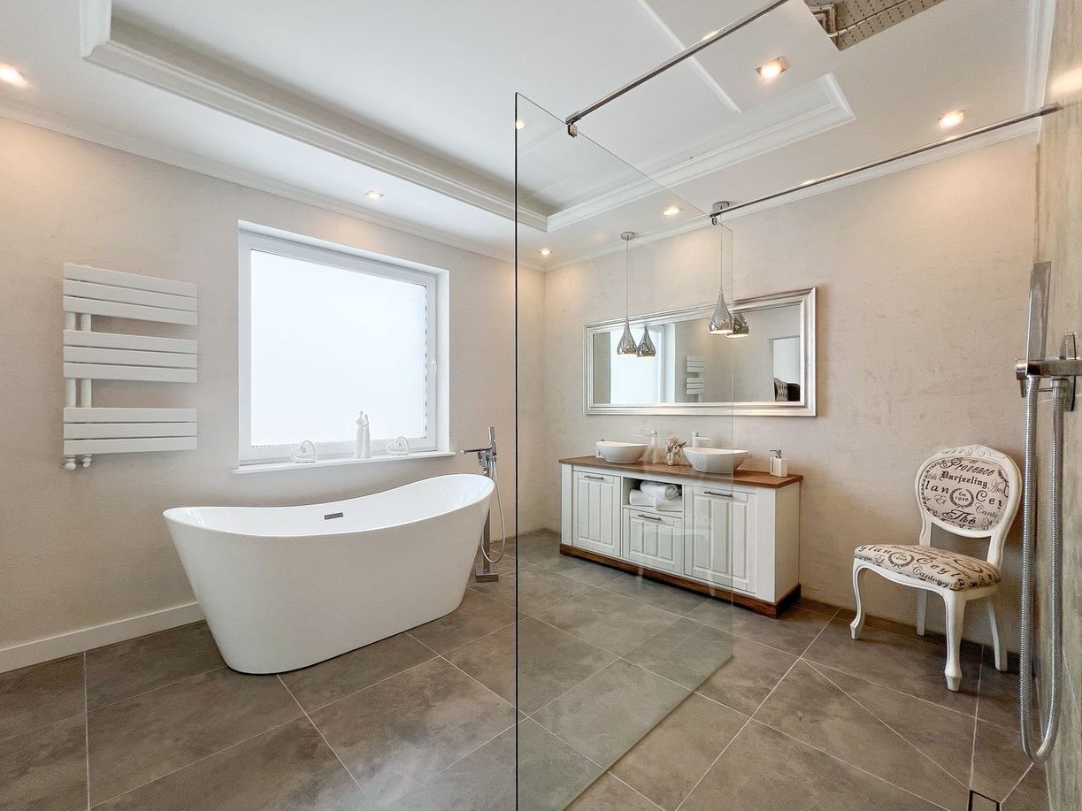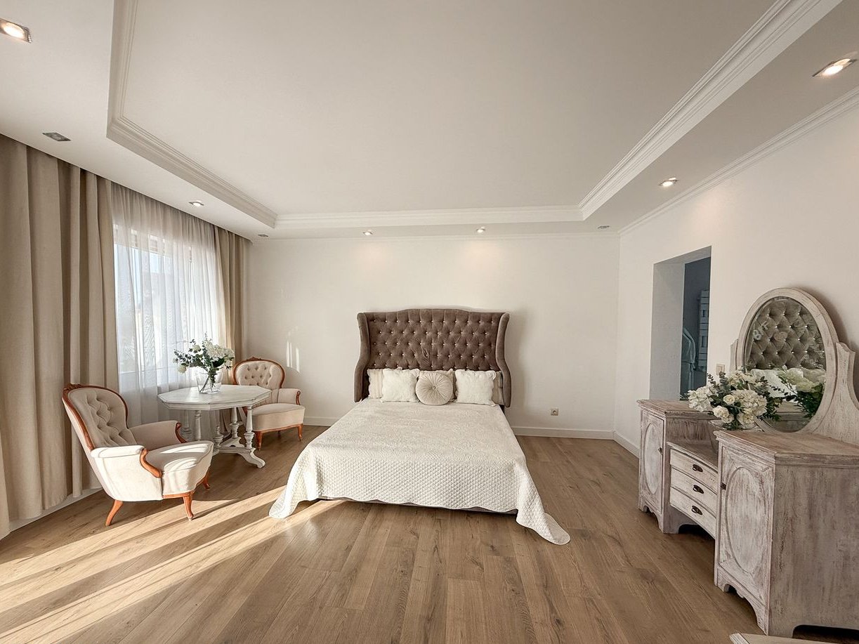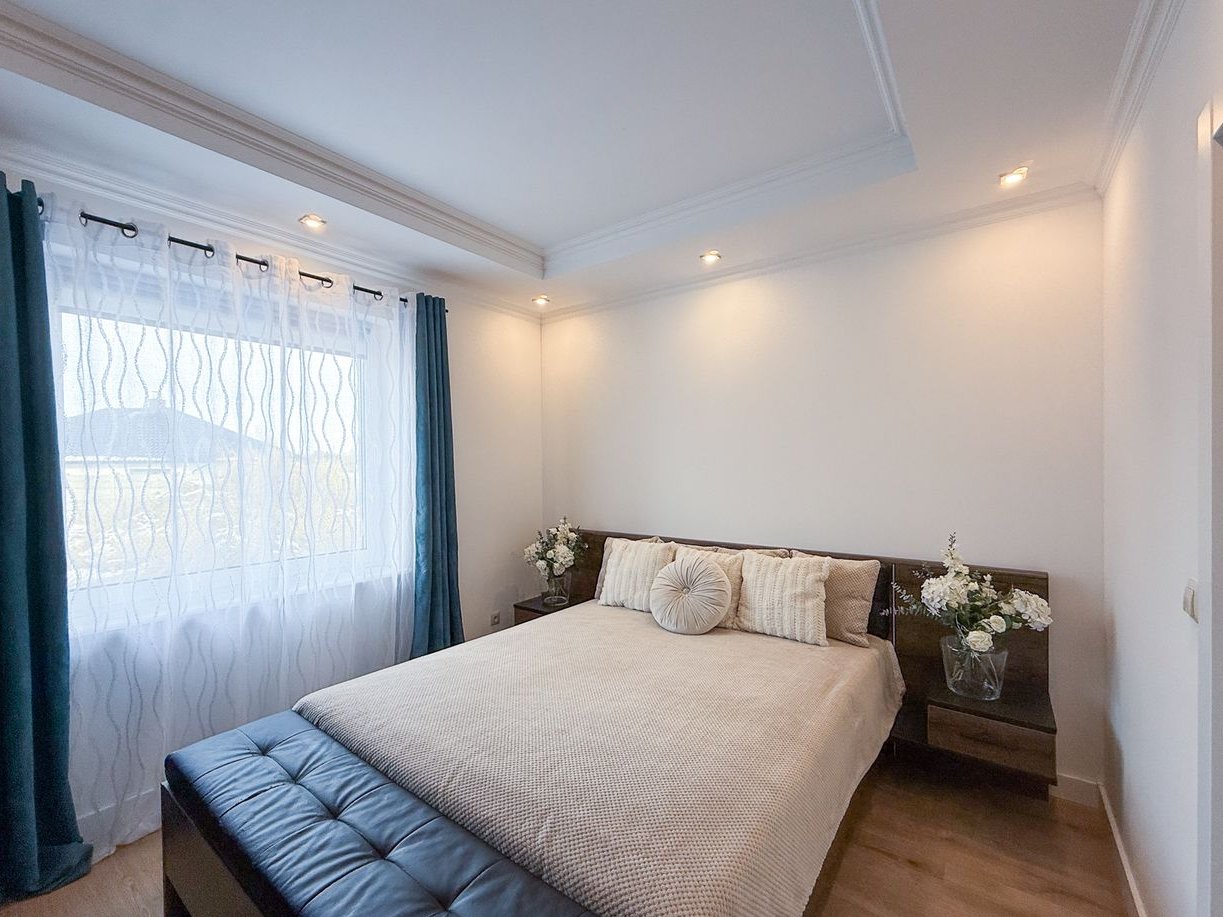 Trzy ustawne sypialnie, w tym wyjątkowa strefa właścicieli obejmująca sypialnię z prywatnym wyjściem na taras, garderobę oraz przestronny salon kąpielowy z wanną wolnostojącą, przeszkloną kabiną prysznicową z odpływem liniowym oraz podwójną umywalką.