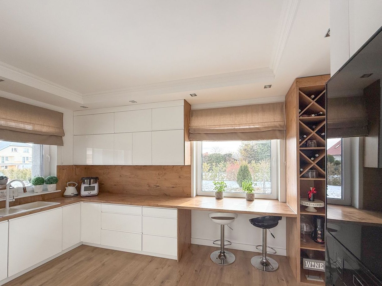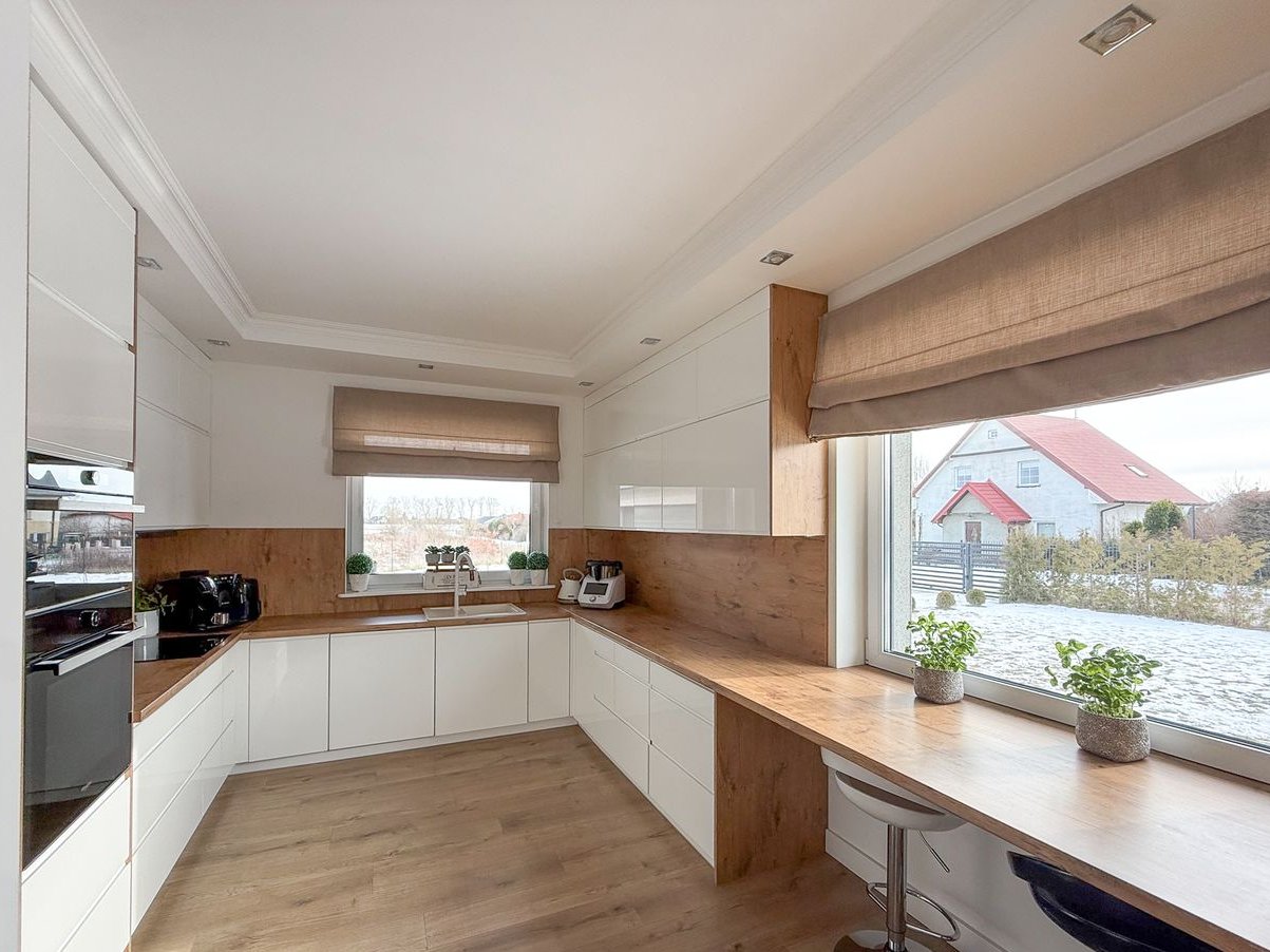 Kuchnia została zaprojektowana jako przestrzeń częściowo otwarta na salon, wyposażona w zabudowę na wymiar oraz pełne AGD (m.in. sprzęt marek Whirlpool i Samsung). Funkcjonalny układ zapewnia wygodę codziennego użytkowania i komfort podczas spotkań z rodziną oraz gośćmi.
