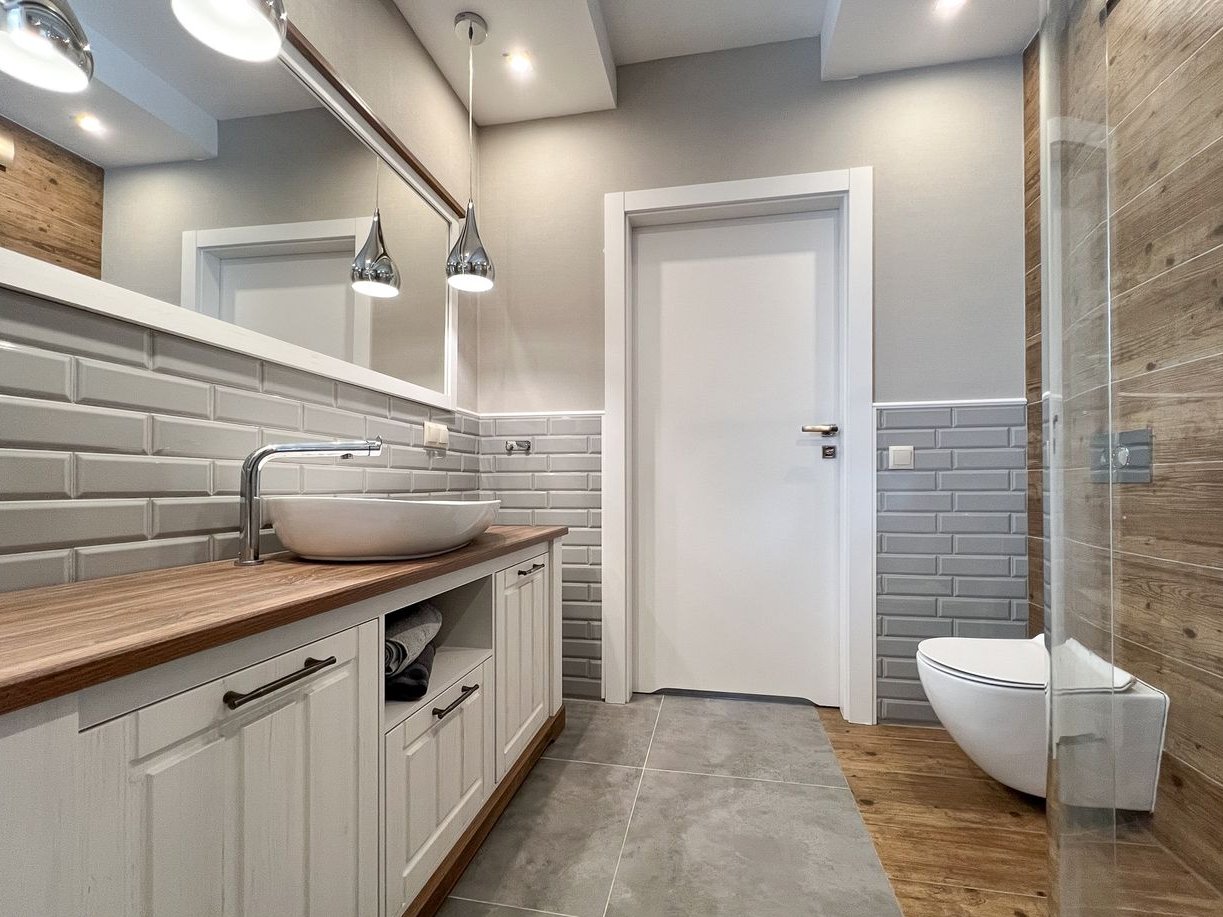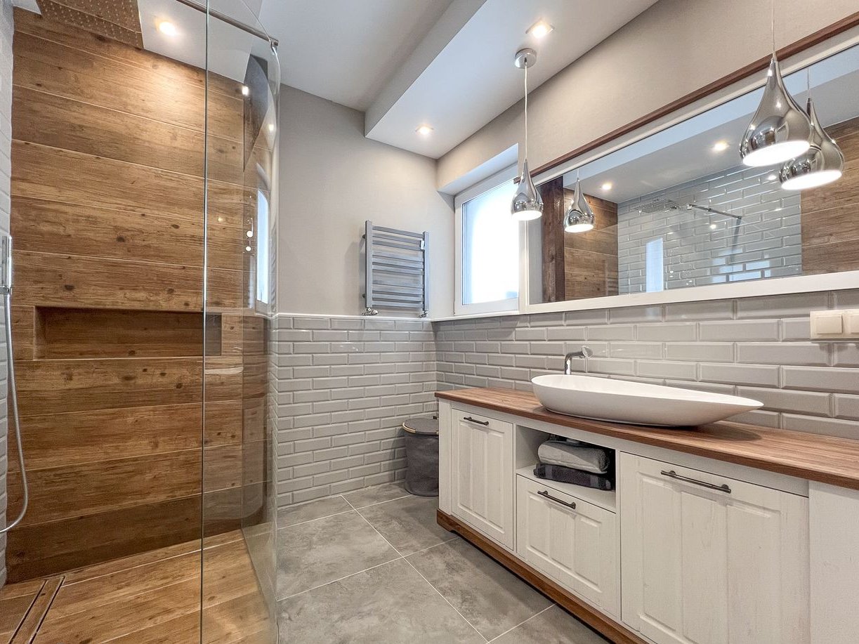 Druga łazienka z prysznicem z giętą szybą, odpływem liniowym oraz wysokiej jakości szafką pod umywalkę.