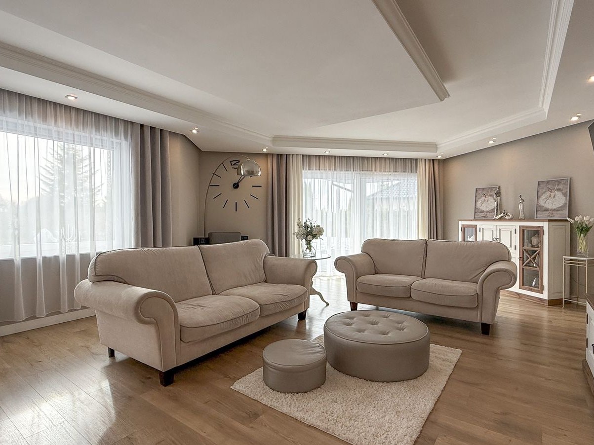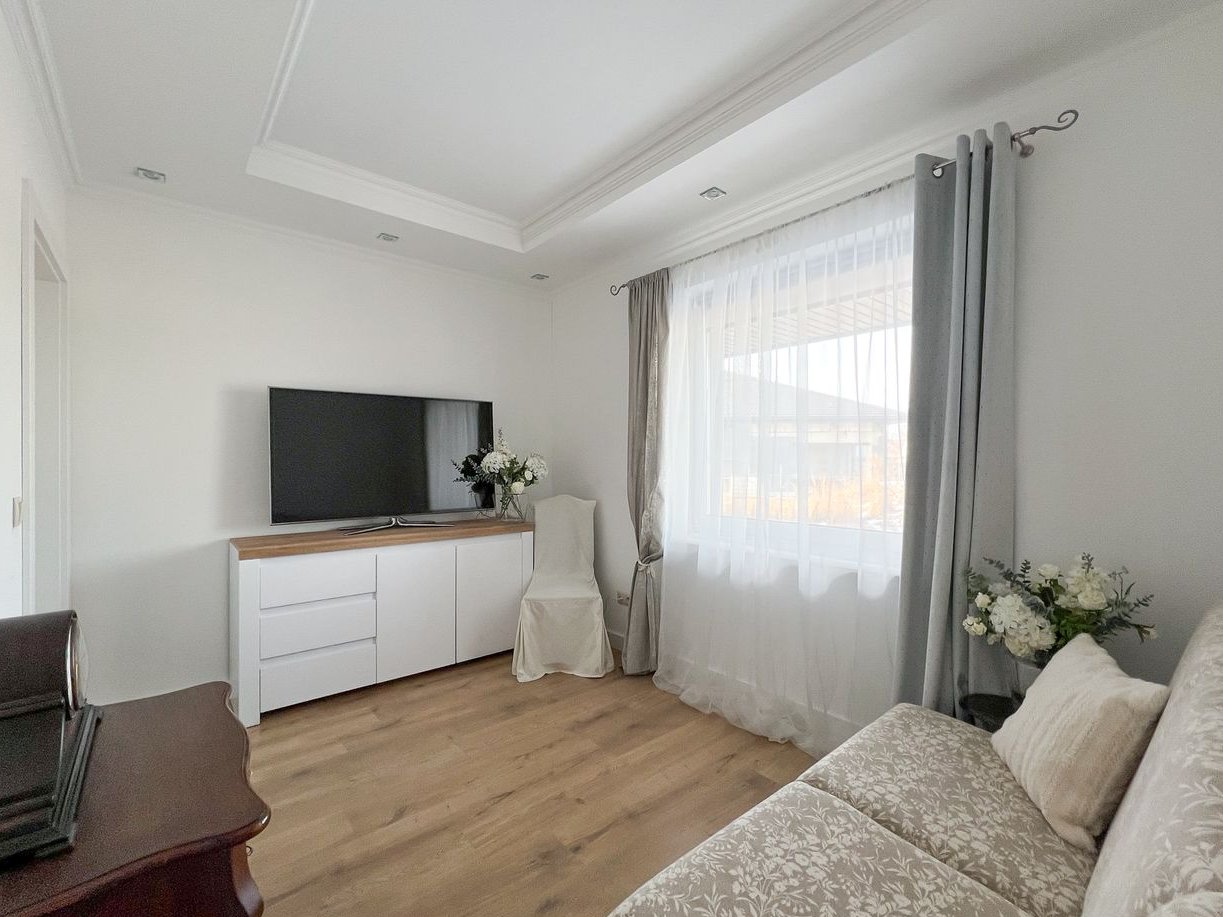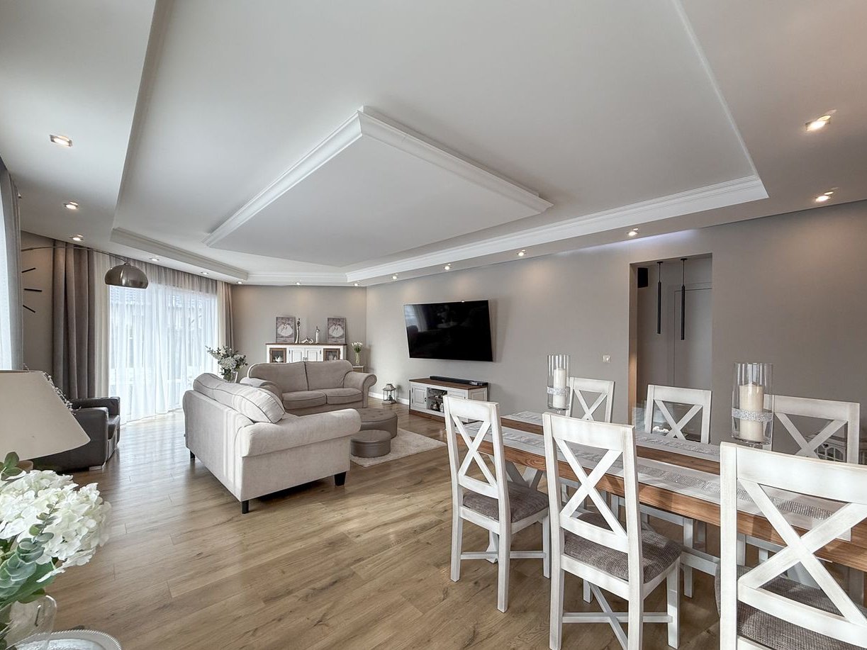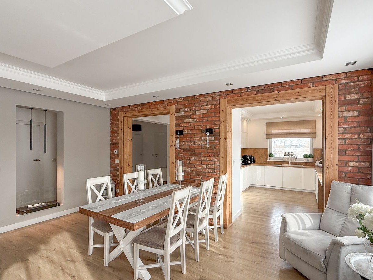 Przestronny, jasny salon o powierzchni 43,62 m² który stanowi serce domu i naturalnie łączy się z częścią jadalnianą oraz kuchenną. Duże, okno tarasowe w systemie przesuwnym doskonale doświetla wnętrze i prowadzi bezpośrednio na drewniany taras o powierzchni około 50 m². W salonie znajduje się nastrojowy bio-kominek, który nadaje wnętrzu przytulnego charakteru. Całość uzupełnia przemyślane oświetlenie punktowe i LED, budujące wyjątkową atmosferę po zmroku.