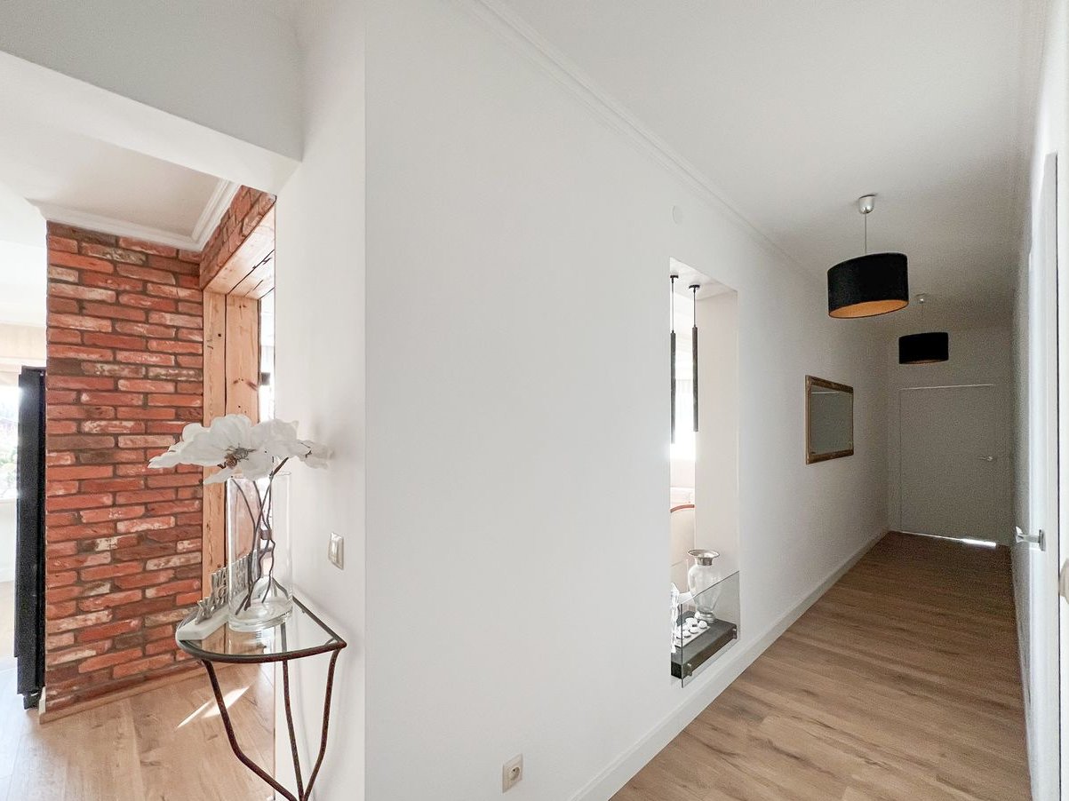 Przedpokój z siedziskiem oraz solidnymi drzwiami wejściowymi prowadzi do hallu pełniącego funkcję komunikacyjną.
