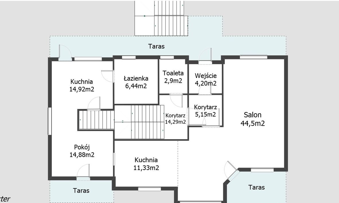 - parter : salon (43,96 m2), wiatrołap (4,13 m2), dwie kuchnie (10,99 i 14,92m2) pokój (14,88 m2), łazienkę (3,80 m2) i WC (2,22 m2);
