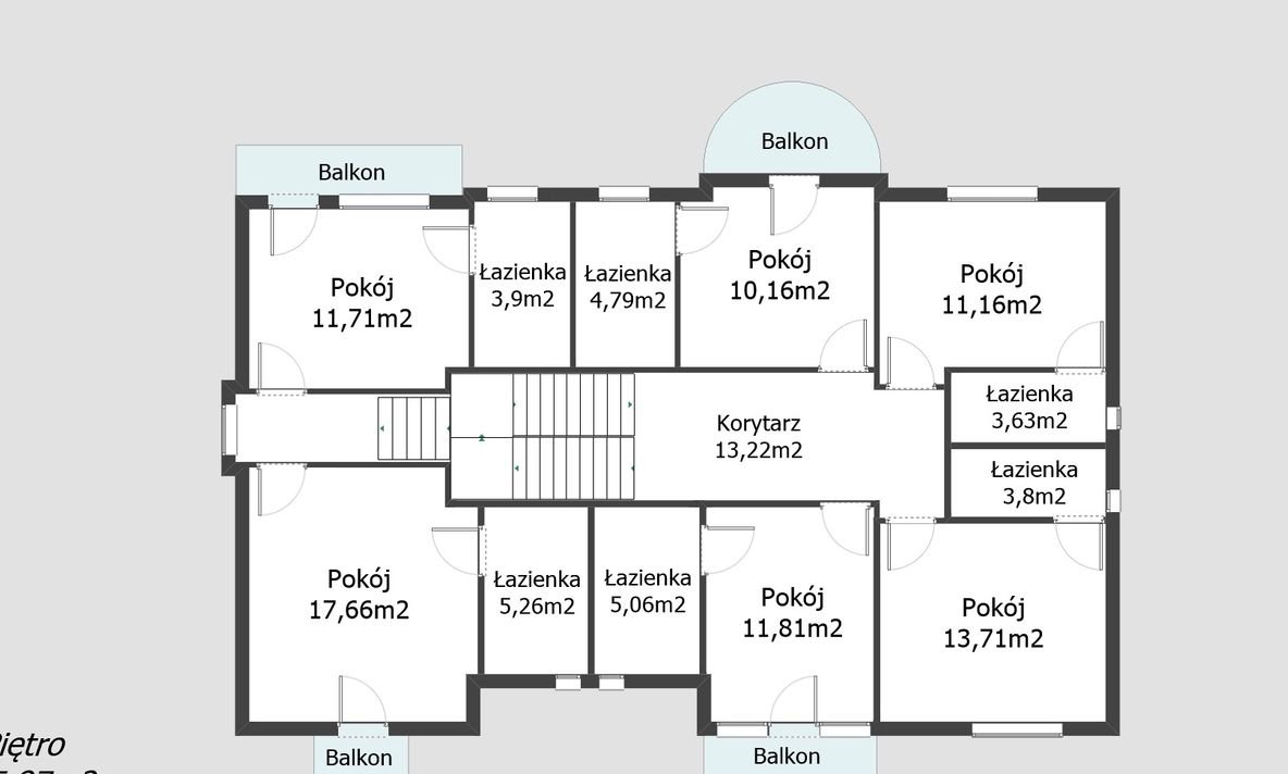 - piętro: hall (13,22 m2 sześć pokoi (13,71 m2, 11,81 m2, 17,66 m2, 11,71 m2, 10,16 m2, 11,16 m2), każdy z łazienką ,