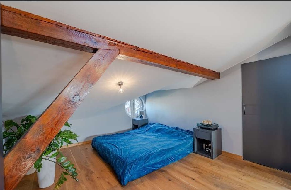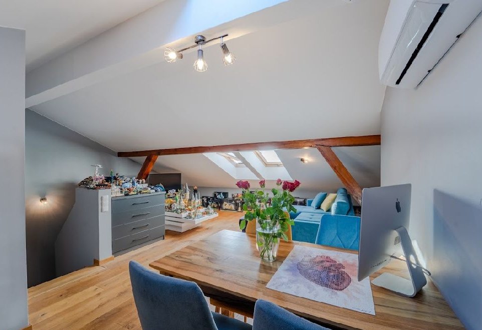 Na poddaszu - 22 m2 powierzchni użytkowej - 54 metry po podłodze, przestronny salon w częścią sypialną oraz wydzielone miejsce do przechowywania.