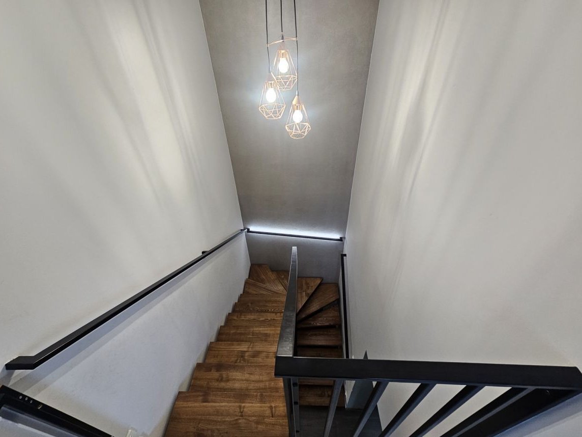 Schody drewniane o konstrukcji metalowej.