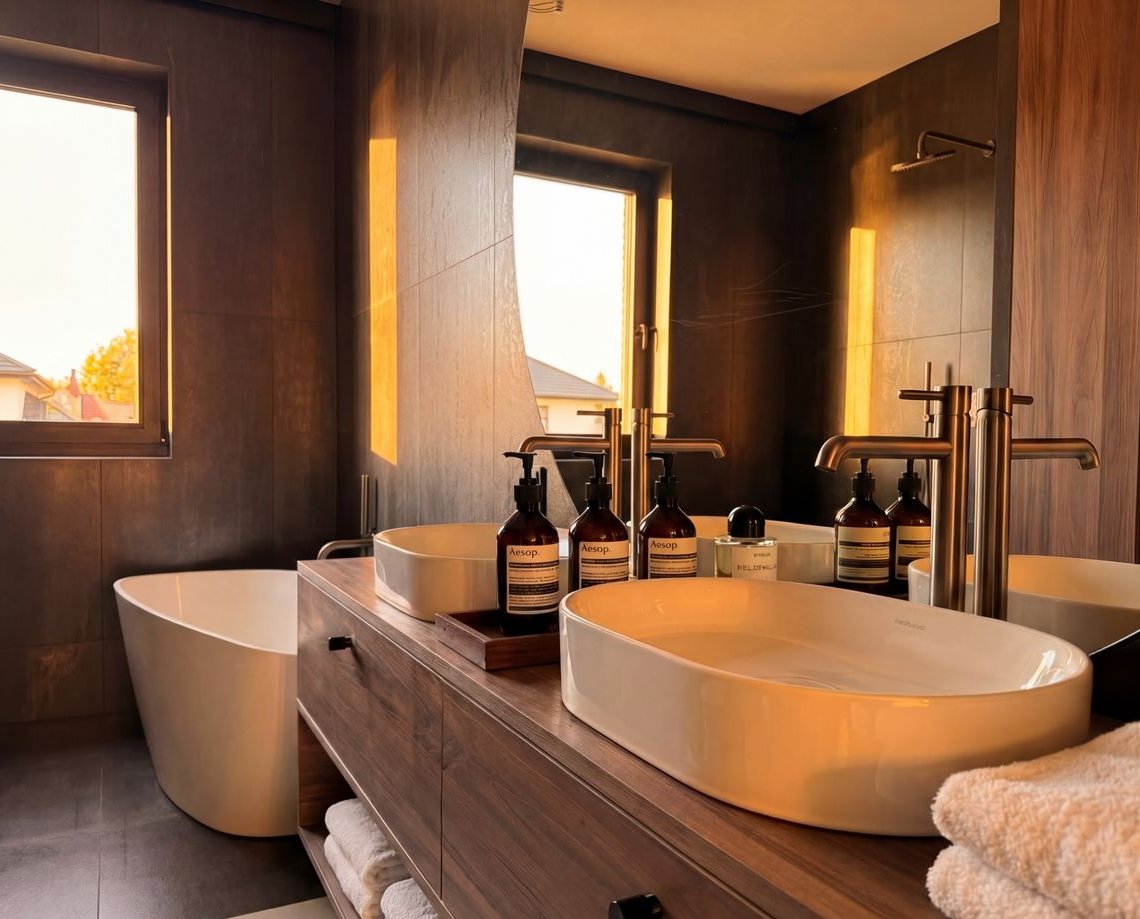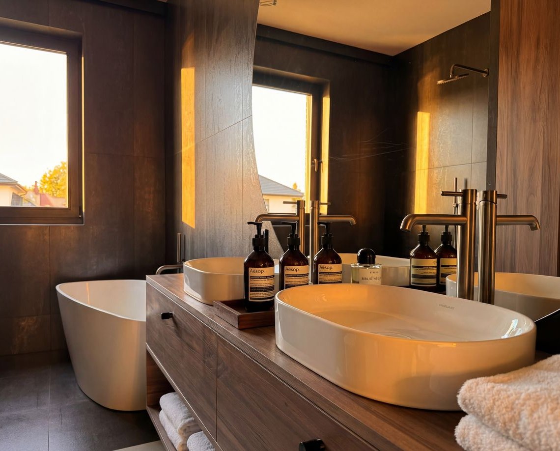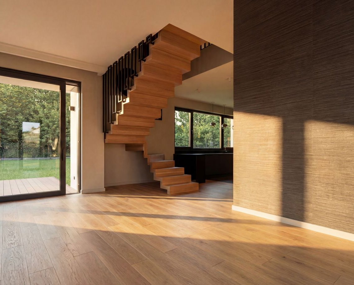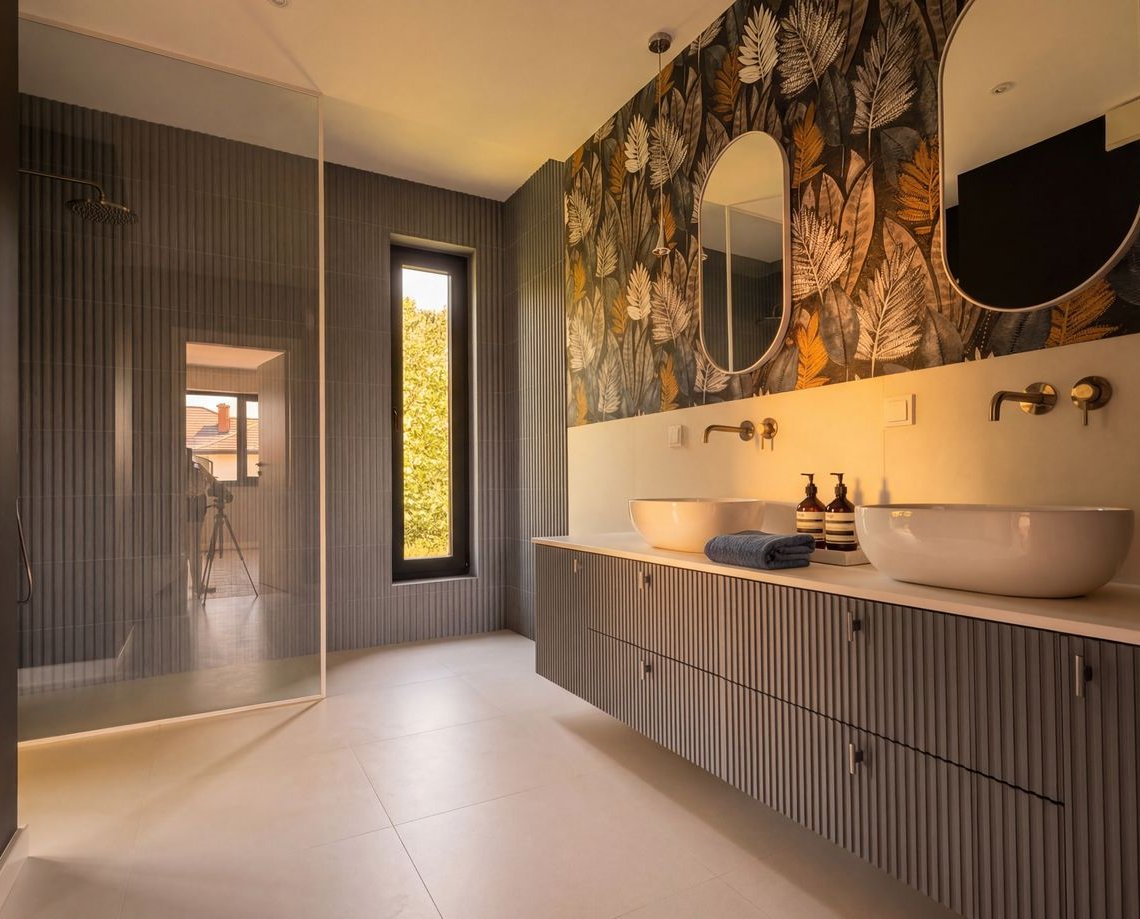 W detalach pojawiają się subtelne odniesienia do natury: balustrady inspirowane linią drzew, tapety z motywami roślinnymi oraz naturalne materiały, które wprowadzają do wnętrz ciepło i harmonię.