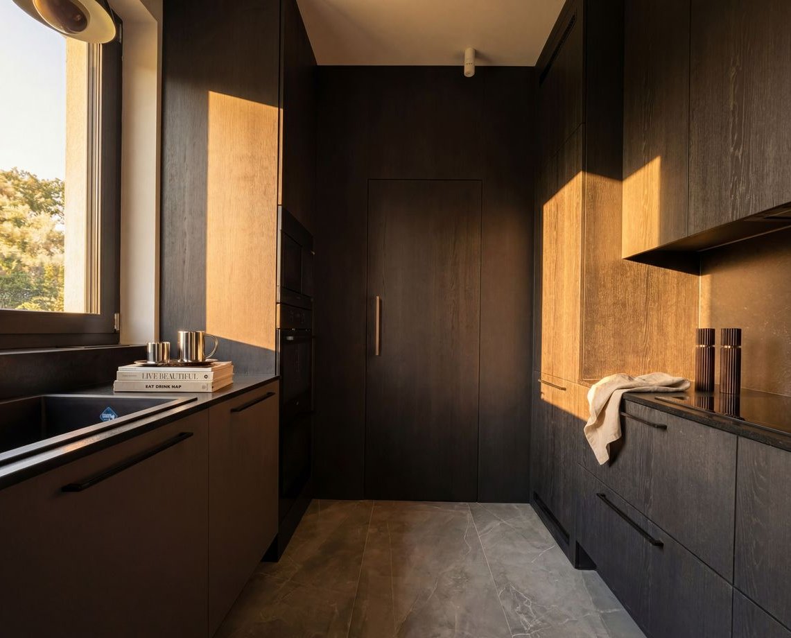 Wykończenie wnętrz zostało zaprojektowane w dialogu z naturą. Inspiracją dla projektu był las znajdujący się w bezpośrednim sąsiedztwie domu – jego rytm, struktura i spokojna kolorystyka.