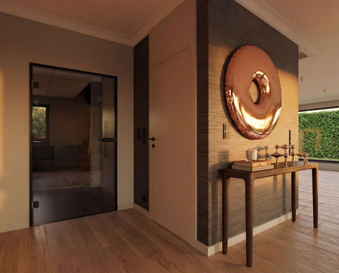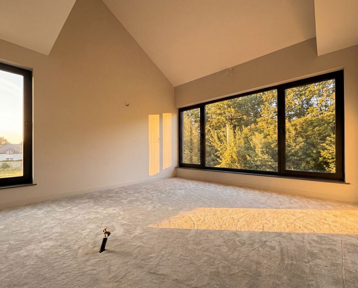 Ten dom został zaprojektowany jako spokojna przestrzeń dla osób, które cenią prywatność, światło i architekturę inspirowaną naturą. Duże przeszklenia otwierają wnętrza na zieleń, a ogród i taras stają się naturalnym przedłużeniem przestrzeni dziennej. To miejsce, w którym poranki zaczynają się spokojniej, a codzienność nabiera rytmu bliższego naturze — mimo że dom znajduje się w Warszawie.
