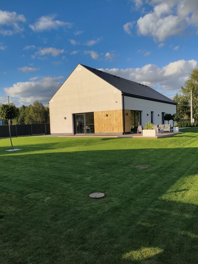 Ogród w pełni przygotowany do użytkowania – podnieśliśmy teren wokół używając prawie 300t ziemi, zasadziliśmy roślinność i wysokiej jakości trawnik