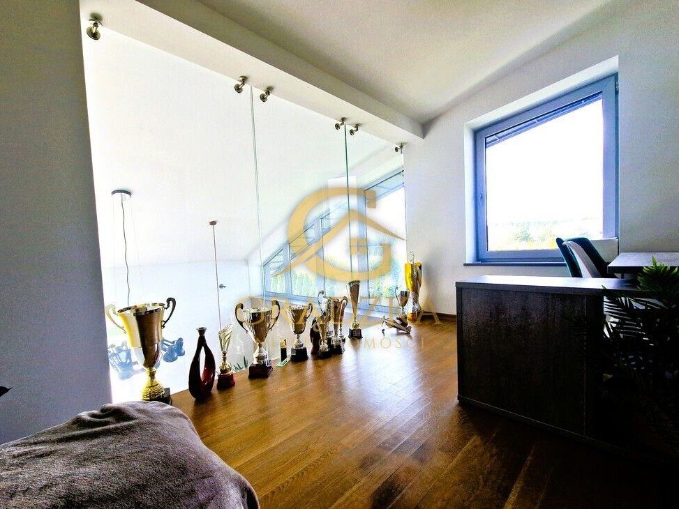 Antresola: Przeszklony gabinet z widokiem na salon – idealne miejsce do pracy kreatywnej.