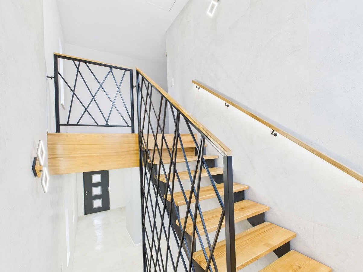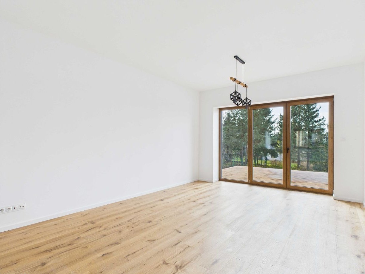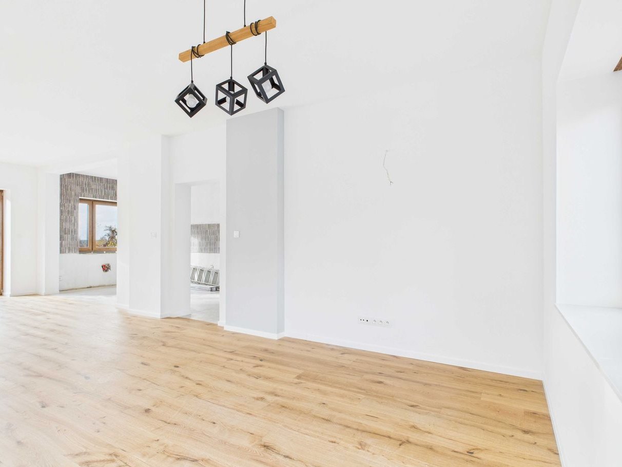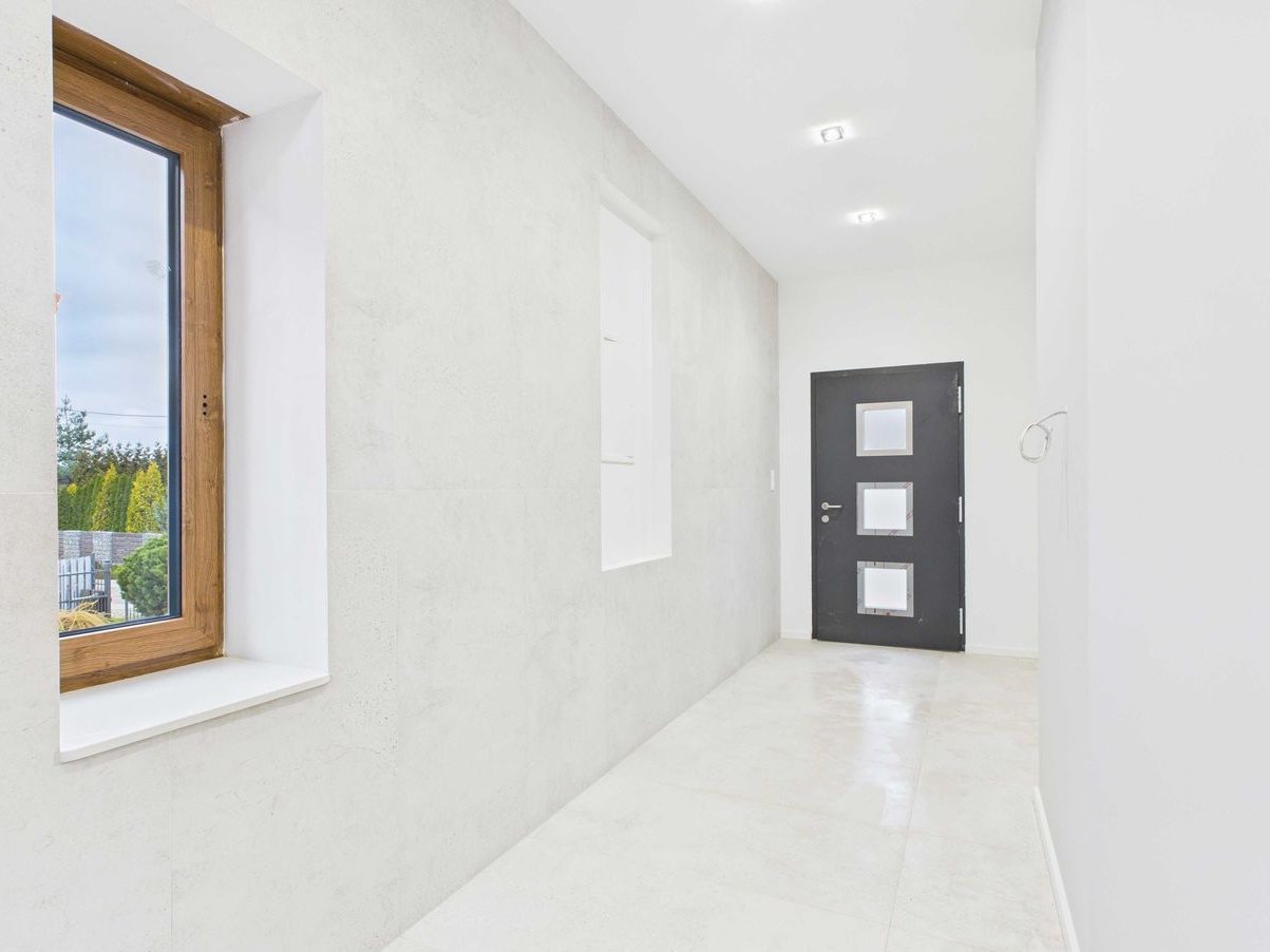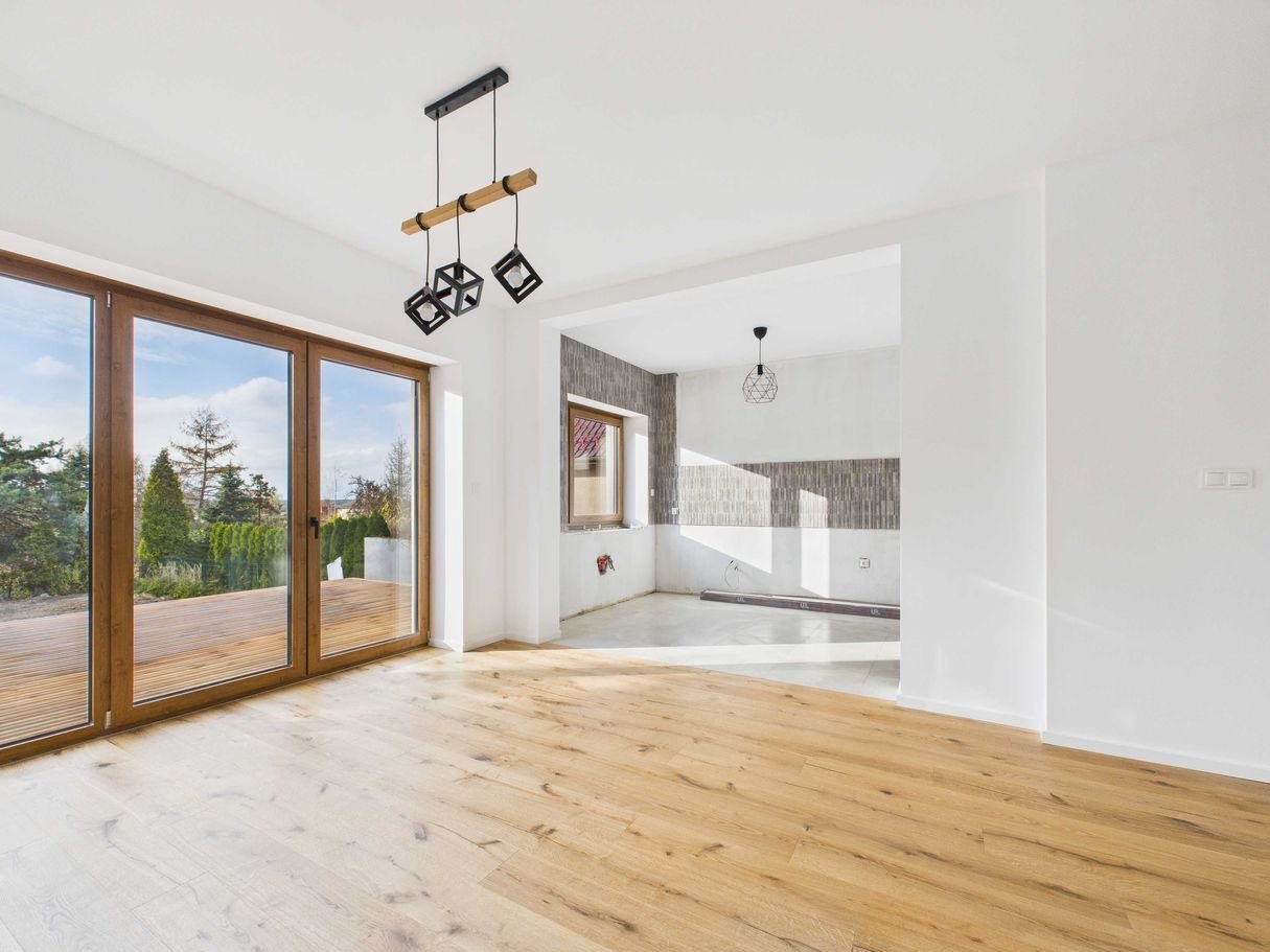 standard wykończenia: gładzie na ścianach, pomalowane na biało, podłoga w salonie: naturalne drewno, hol, kuchnia, łazienka w kaflach, drzwi wewnętrzne, zamontowane oświetlenie boczne i sufitowe, drzwi