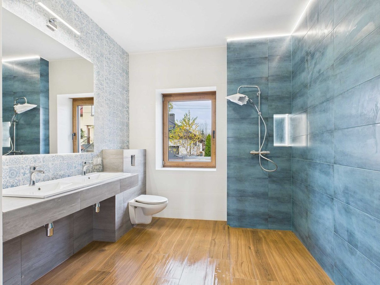 Przestronna łazienka z prysznicem walk in w pełni wyposażona, z oknem, z przygotowanymi miejscami do przechowywania