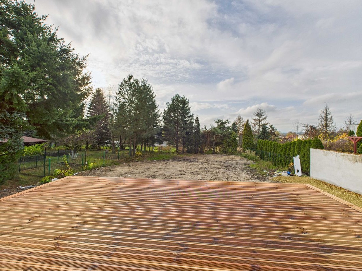 drewniany taras z drewna olejowany, wymaga montażu bariery w zależności od potrzeb nowych właścicieli. Budowa tarasu umożliwia przeszklenie powierzchni.