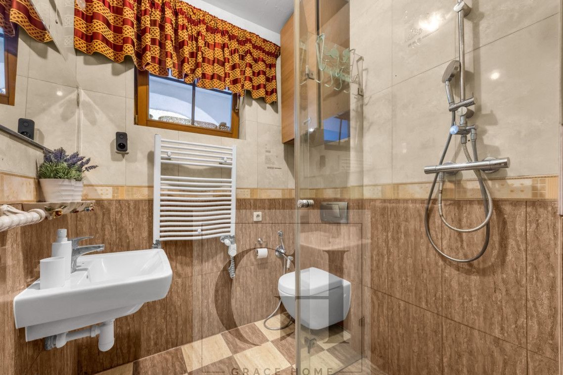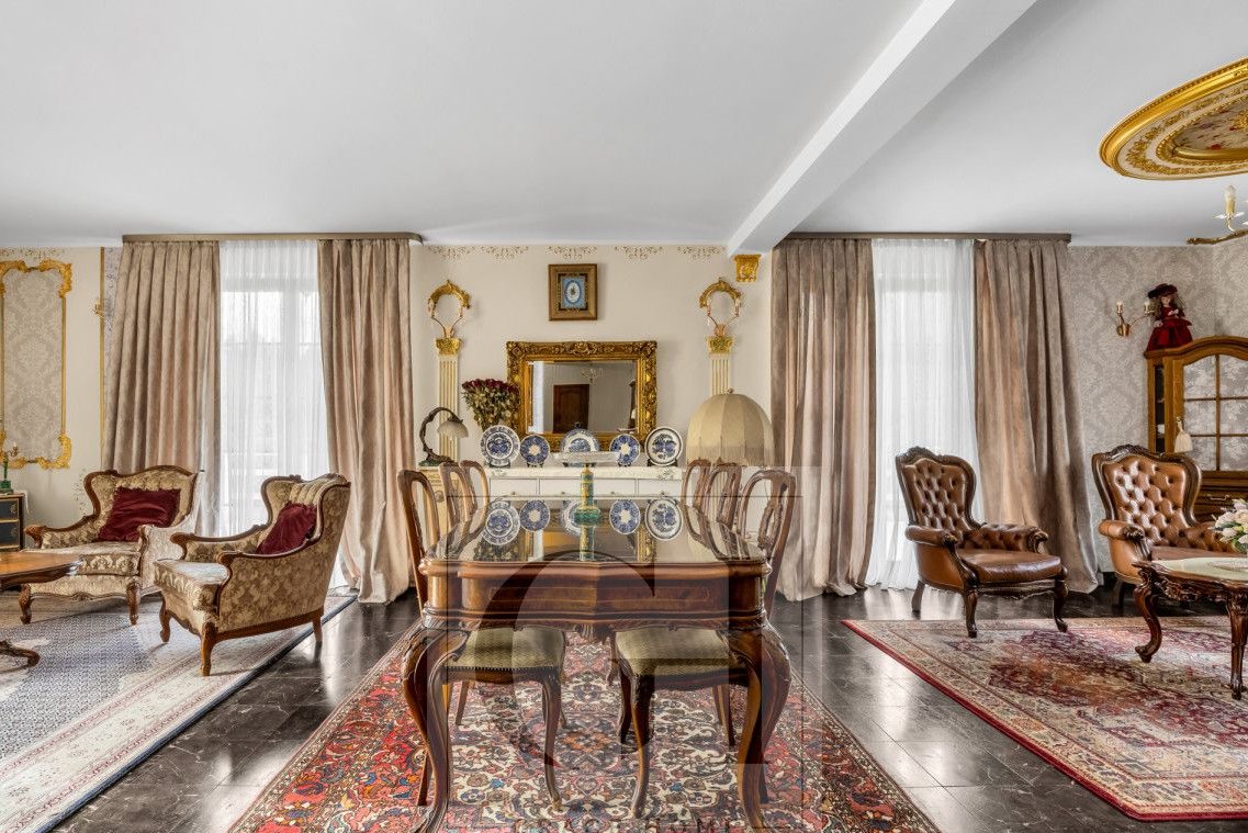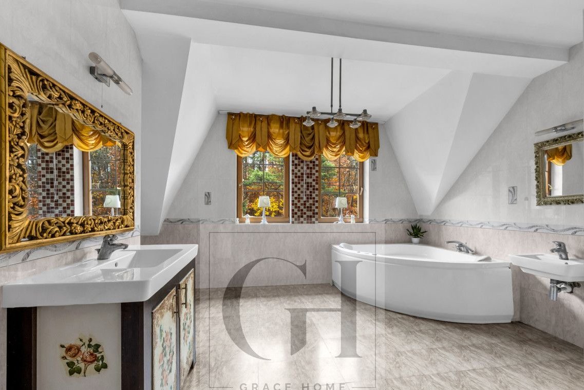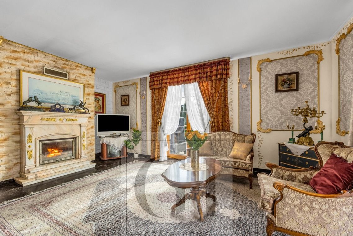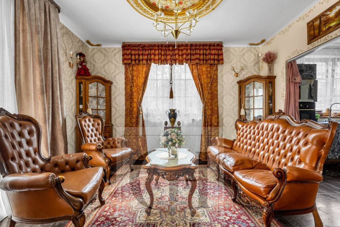 Parter domu to reprezentacyjna, bogato wykończona przestrzeń. Styl wnętrza łączy ozdobność Wschodu z europejską klasyką. Centralnym punktem jest rozległy salon, przypominający trzy połączone pokoje. W części wypoczynkowej mamy kominek, który rozprowadza ciepło po całym domu jako dodatkowe źródło ogrzewania. Druga część pełni rolę jadalni z dużym stołem, a trzecia - kącika kawowego - zaprasza do rozmów przy aromacie mocnej kawy.