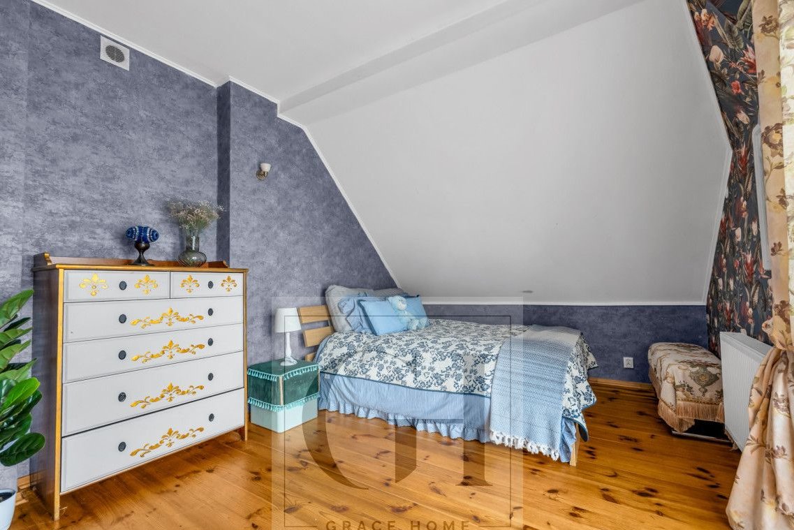 Na piętrze zaprojektowano cztery sypialnie z dostępem do balkonów, jedna z nich z własną garderobą oraz pokój gościnny. Do wszystkich pomieszczeń wchodzimy z dużego korytarza, nie ma pokoi przejściowych. Mieszkańcy mają do dyspozycji także obszerną łazienkę, pralnię oraz dodatkową przestrzeń przy łazience, którą można przeznaczyć na saunę.