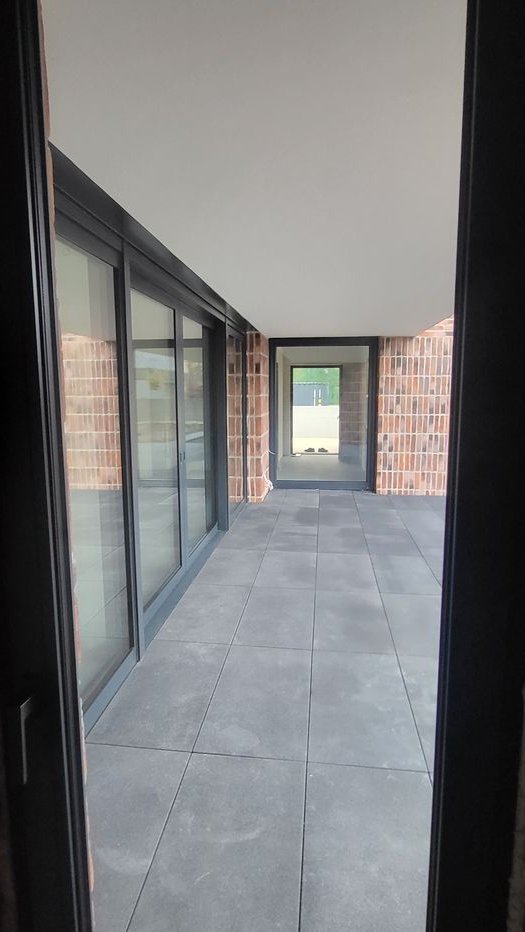 Stolarka okienna 3-szybowa z wyjściem na taras przez zespół aluminiowych okien o szerokości 600 cm w systemie HS z rozsuwanymi drzwiami na dwie strony. Rolety na wszystkich oknach.