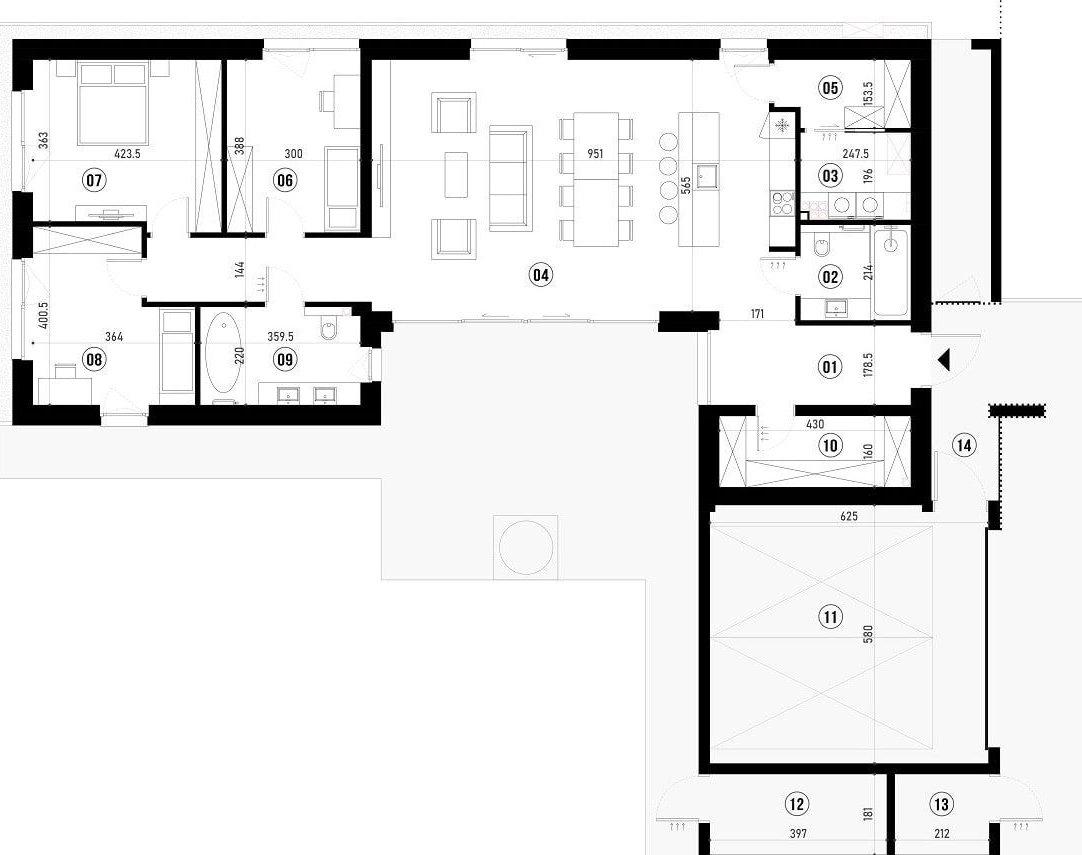 3 sypialnie, salon z jadalnią i kuchnią, 2 łazienki, garderoba, zaplecze suche, pralnia