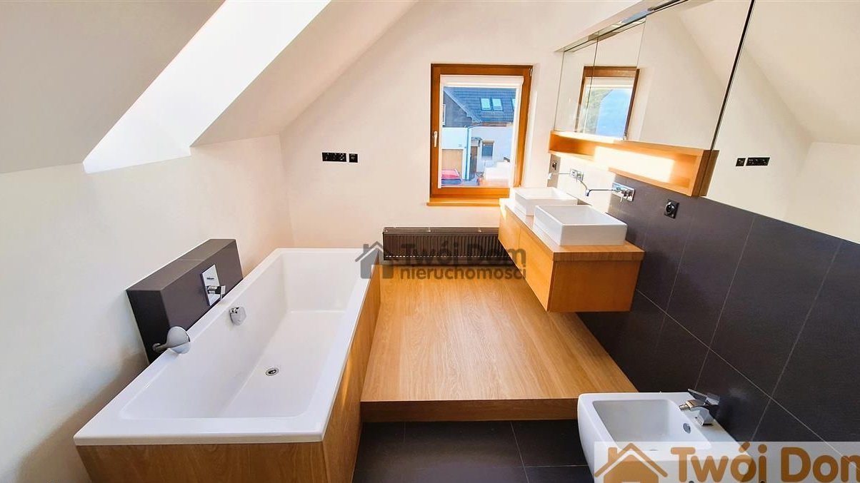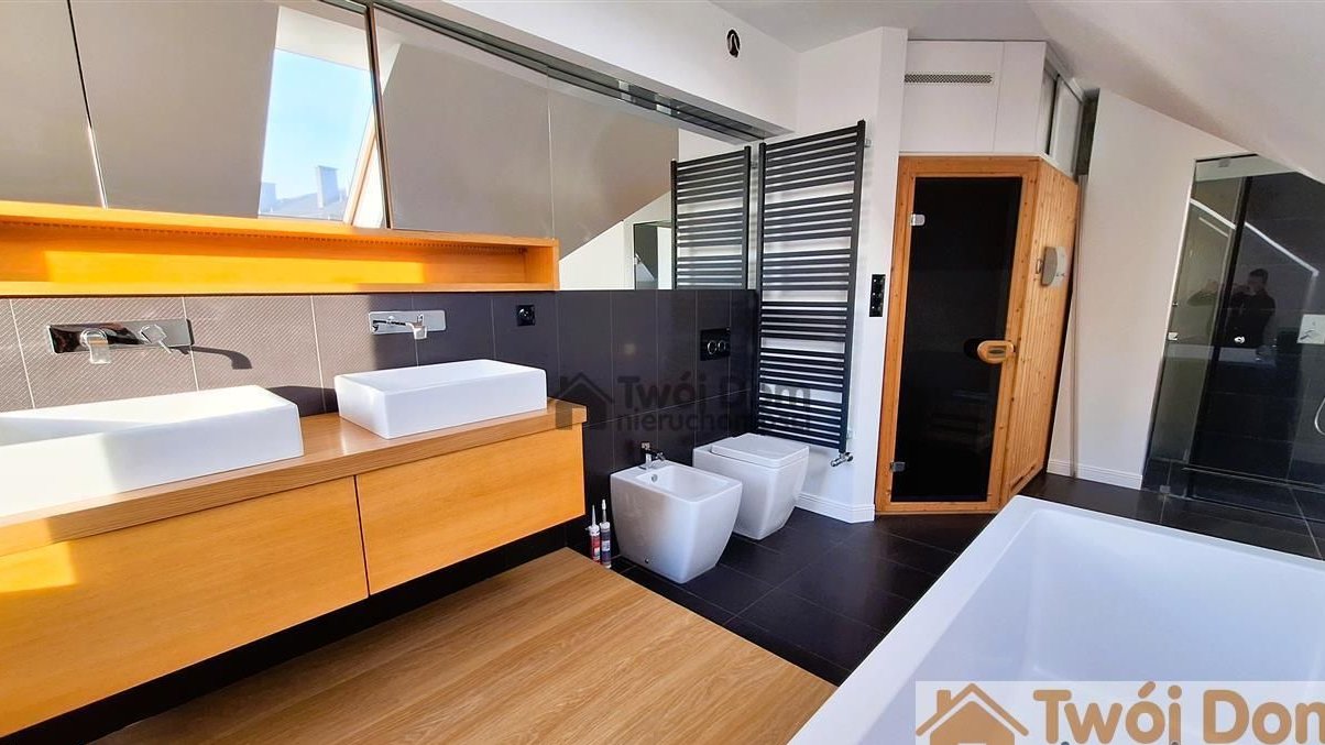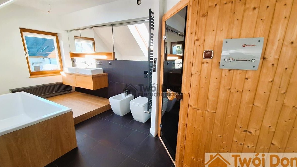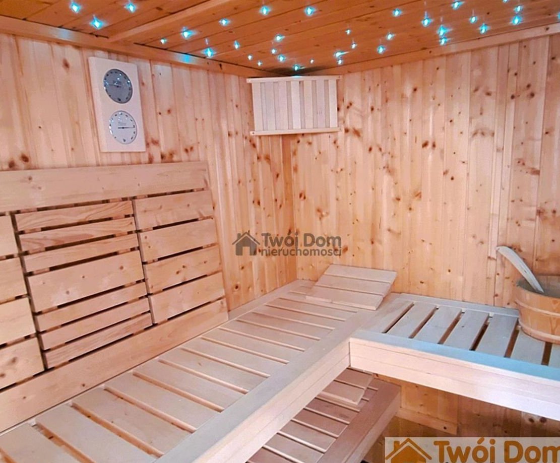 Dom wyróżnia się przemyślanym układem, wysokim standardem wykończenia oraz licznymi udogodnieniami, takimi jak nowoczesna instalacja fotowoltaiczna z magazynem energii, sauna, kominek i drewniany taras, kilka miejsc parkingowych, automatyczne podlewanie i koszenie ogrodu. Elektryczne rolety we wszystkich oknach na parterze i na piętrze, sterowane jednym przyciskiem-bezpieczeństwo. Światłowód.