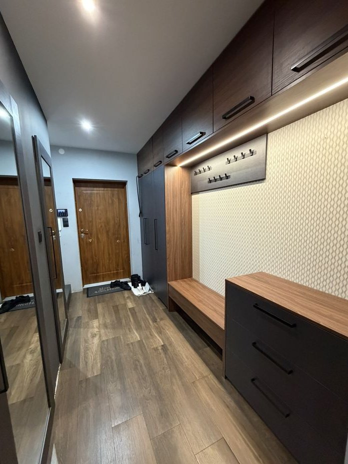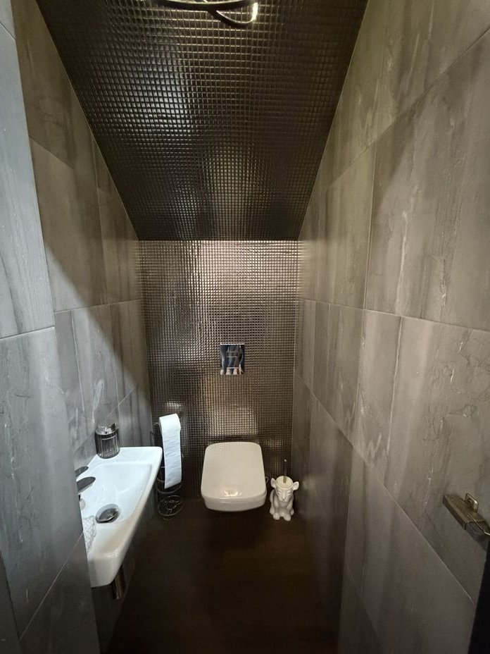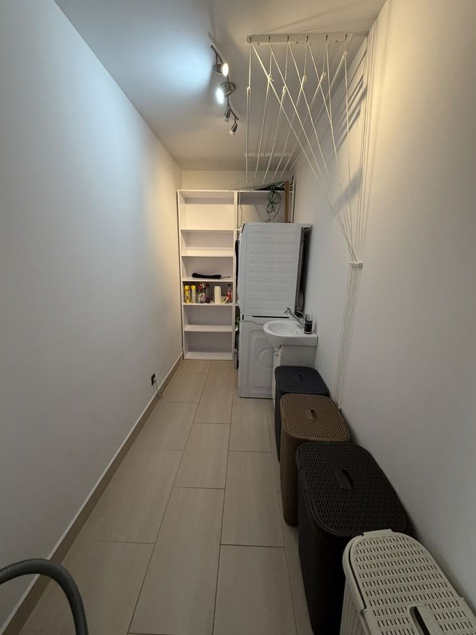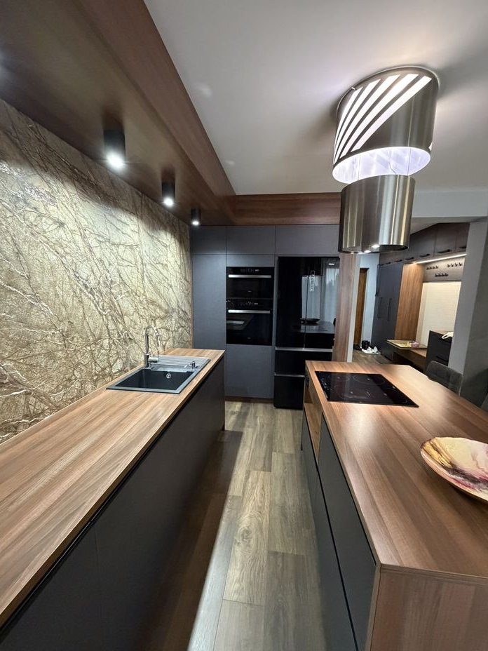 Na parterze mieści się jednostanowiskowy garaż, przedpokój z miejscem do przechowywania, toaleta, kotłownia oraz salon z kuchnią. Z salonu wyjście na taras ok 32m2. Kuchnia wyposażona jest we wszystkie sprzęty, zabudowa stolarska. Na ścianie kuchennej slaby z marmuru rainforest brown.