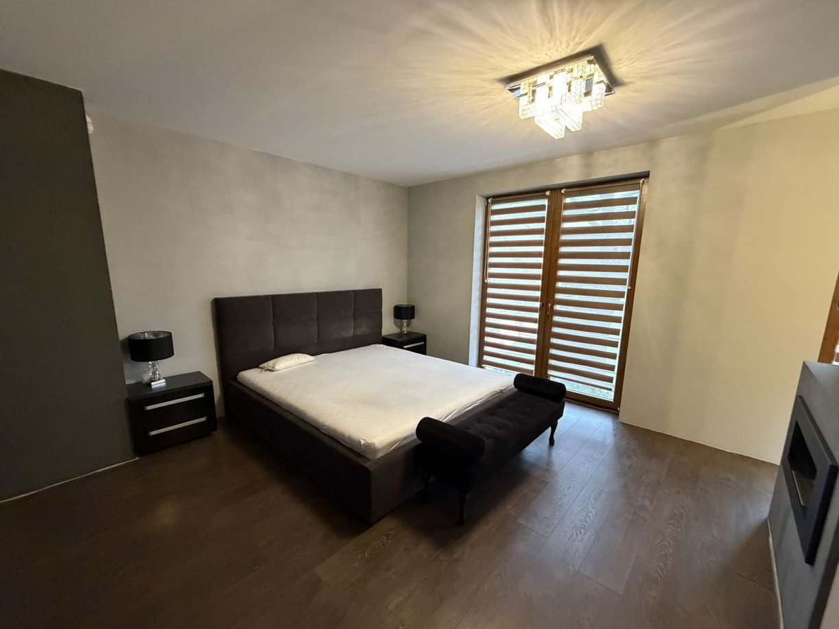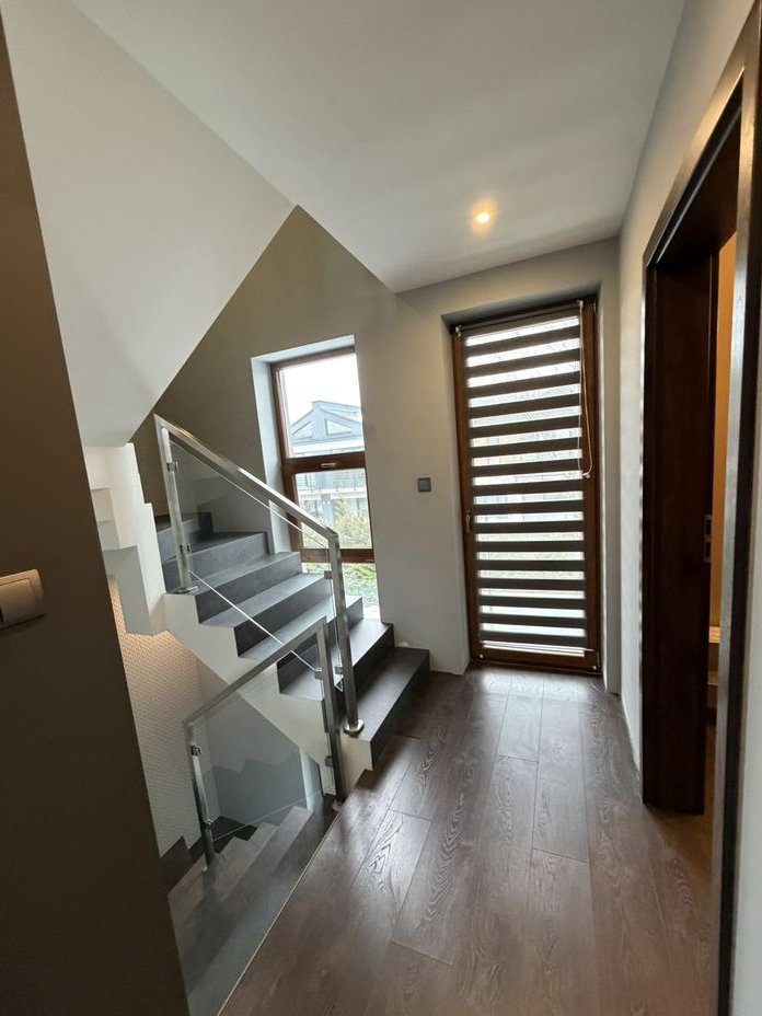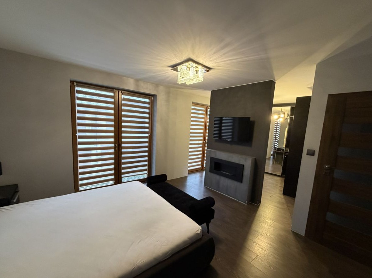 Na piętrze znajduje się pokuj/biuro, łazienka z wanną, pralnia oraz duża sypiania z biokominkiem, garderobą i klimatyzacją.