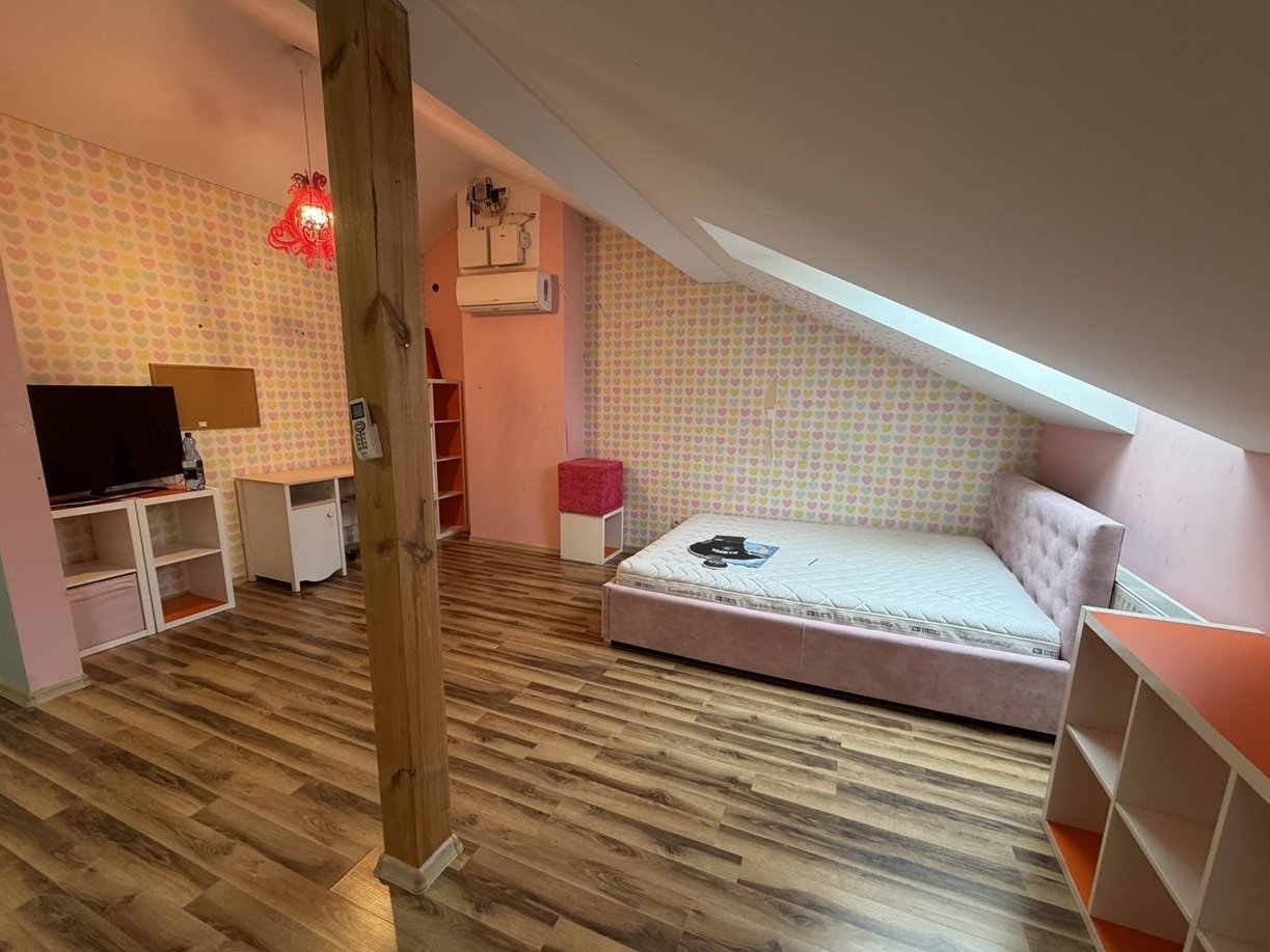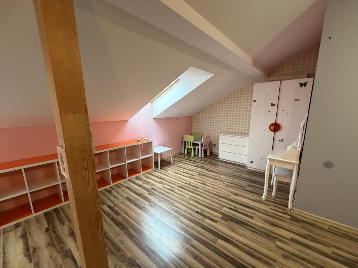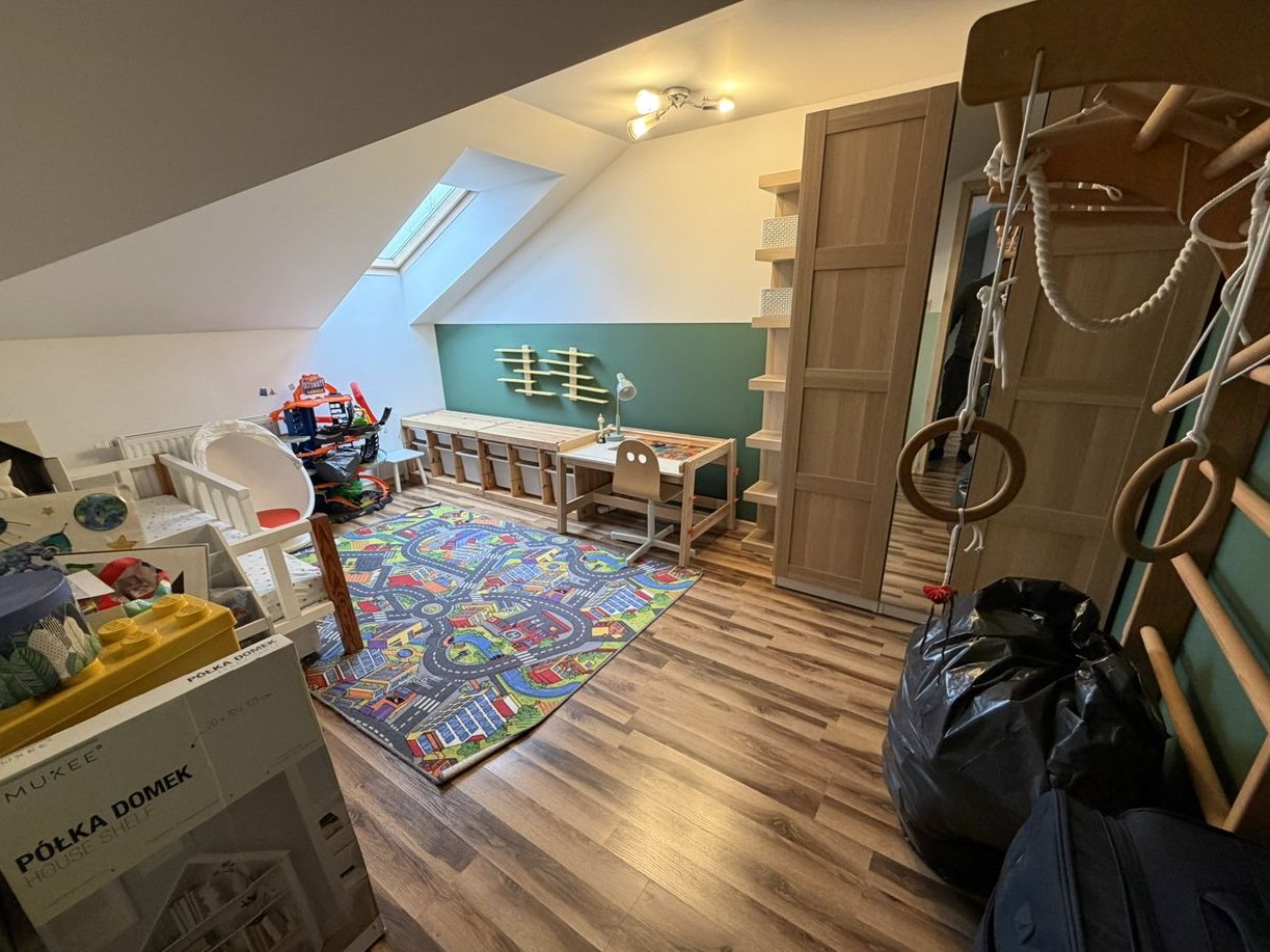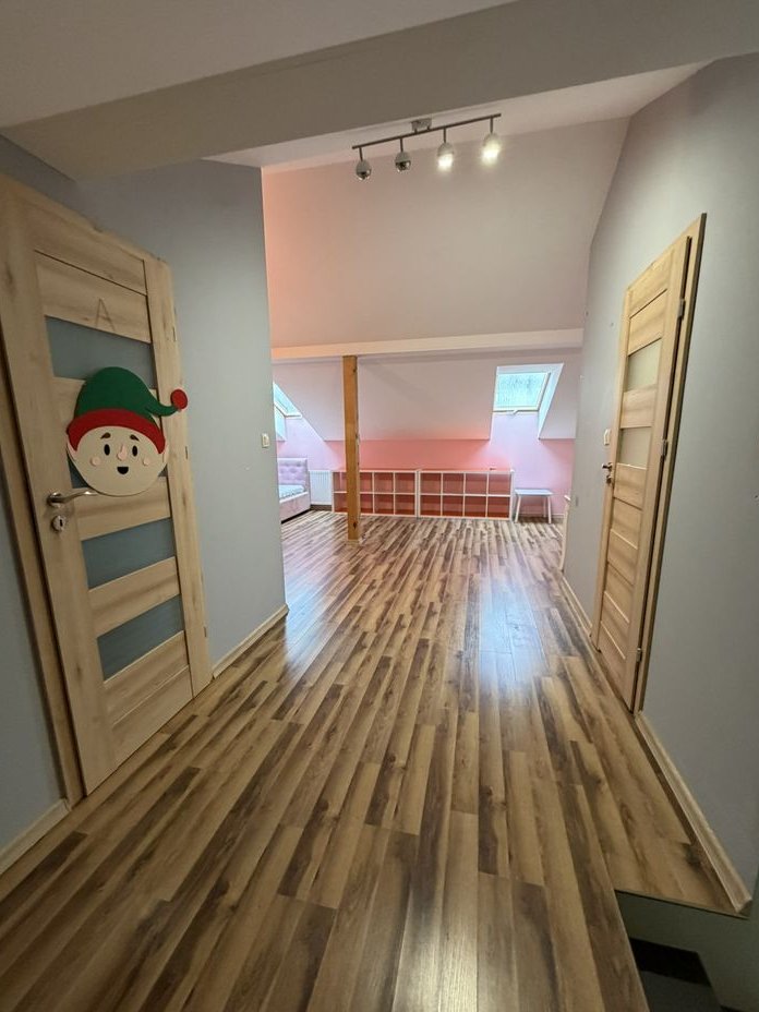 Na poddaszu jest duży otwarty pokój z klimatyzacją , sypialnia oraz łazienka z wanną.