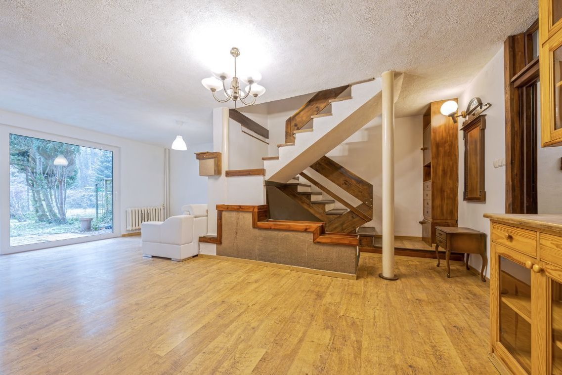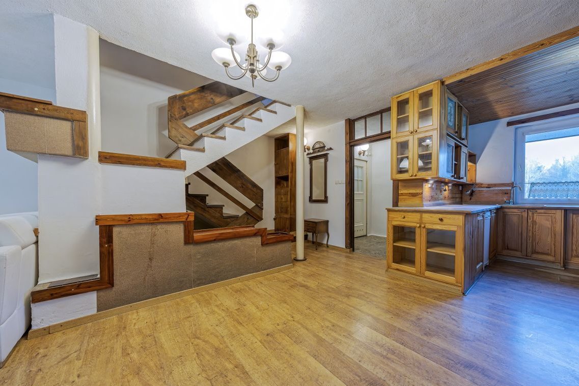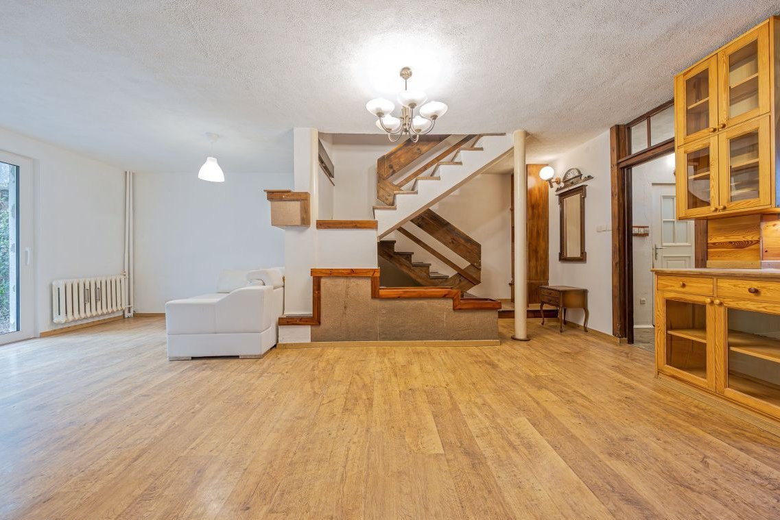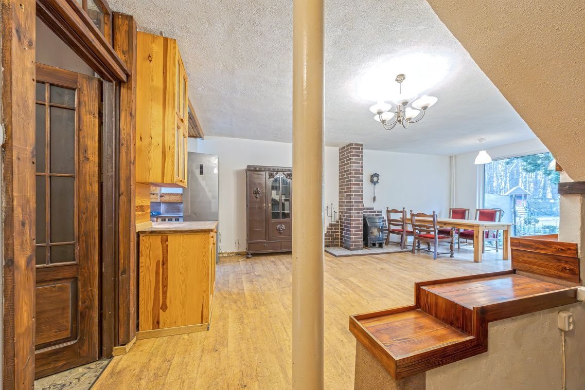 Dom utrzymany jest w klasycznej stylistyce, a część pomieszczeń wymaga remontu i odświeżenia. Dla przyszłego właściciela stanowi to jednak dużą zaletę — daje pełną swobodę w zaaranżowaniu wnętrz zgodnie z własnymi potrzebami. Liczne okna sprawiają, że przestrzenie są jasne i dobrze doświetlone o każdej porze dnia. Wejście do budynku zaplanowano od strony północnej, natomiast ogród znajduje się po stronie południowej, co pozwala maksymalnie wykorzystać naturalne światło. Zastosowanie dużych, przeszklonych drzwi tarasowych w salonie tworzy wrażenie płynnego przejścia między wnętrzem a ogrodem, dzięki czemu oba te miejsca stają się spójną, harmonijną całością.