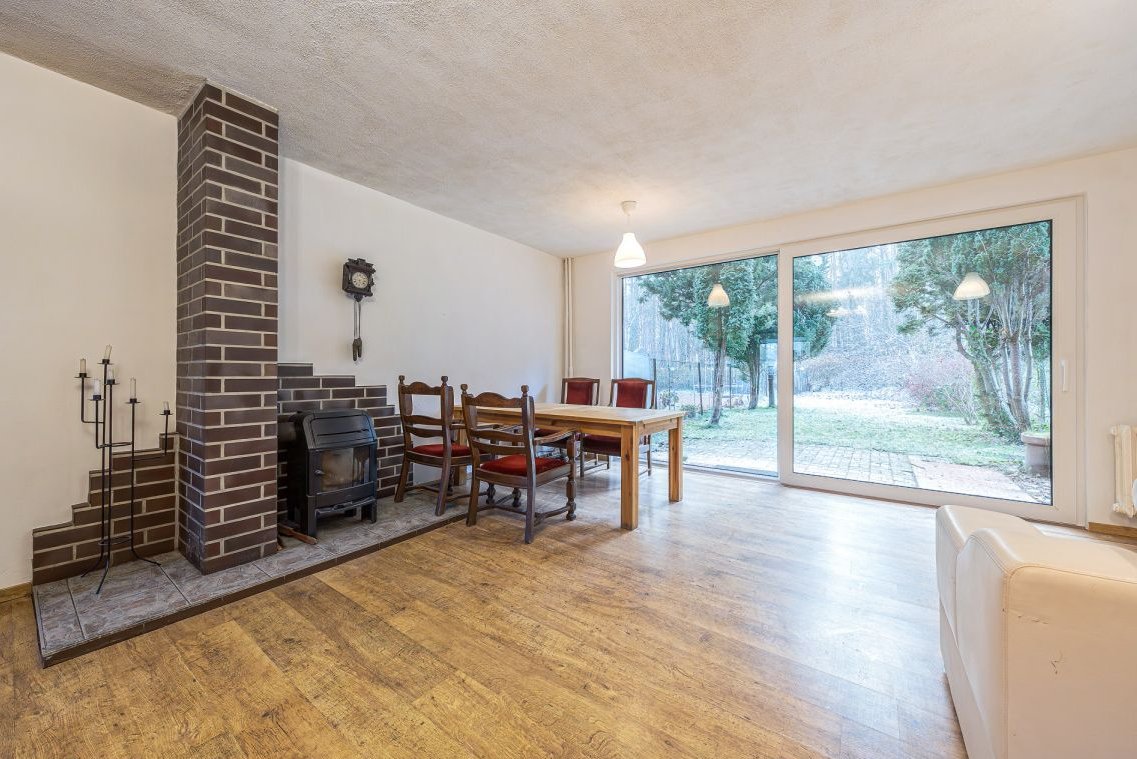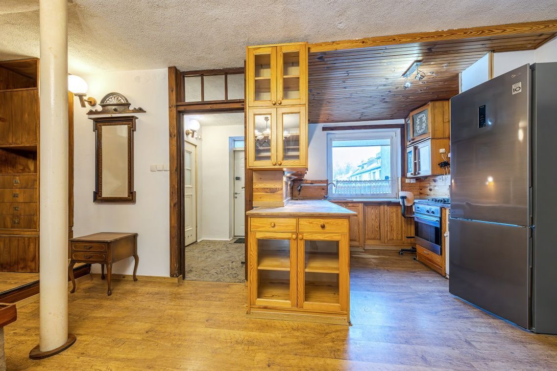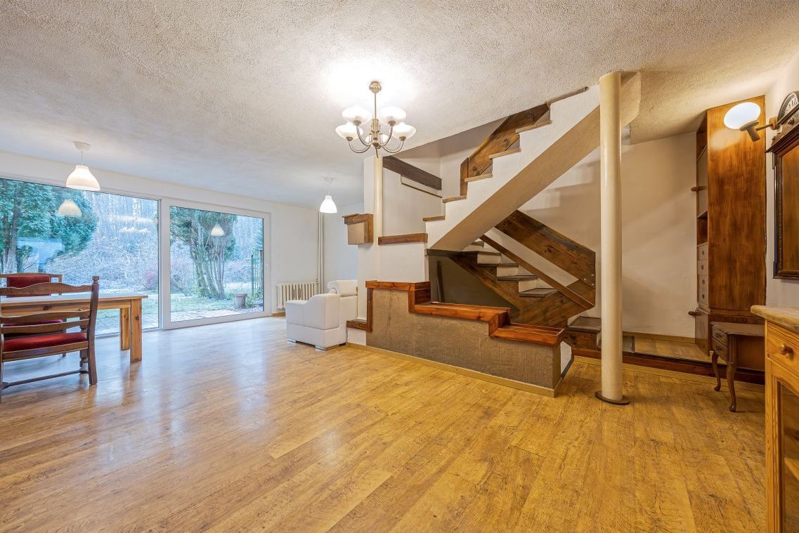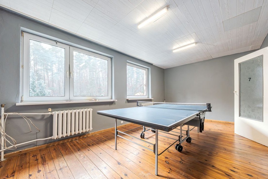 Dom utrzymany jest w klasycznej stylistyce, a część pomieszczeń wymaga remontu i odświeżenia. Dla przyszłego właściciela stanowi to jednak dużą zaletę — daje pełną swobodę w zaaranżowaniu wnętrz zgodnie z własnymi potrzebami. Liczne okna sprawiają, że przestrzenie są jasne i dobrze doświetlone o każdej porze dnia. Wejście do budynku zaplanowano od strony północnej, natomiast ogród znajduje się po stronie południowej, co pozwala maksymalnie wykorzystać naturalne światło. Zastosowanie dużych, przeszklonych drzwi tarasowych w salonie tworzy wrażenie płynnego przejścia między wnętrzem a ogrodem, dzięki czemu oba te miejsca stają się spójną, harmonijną całością.