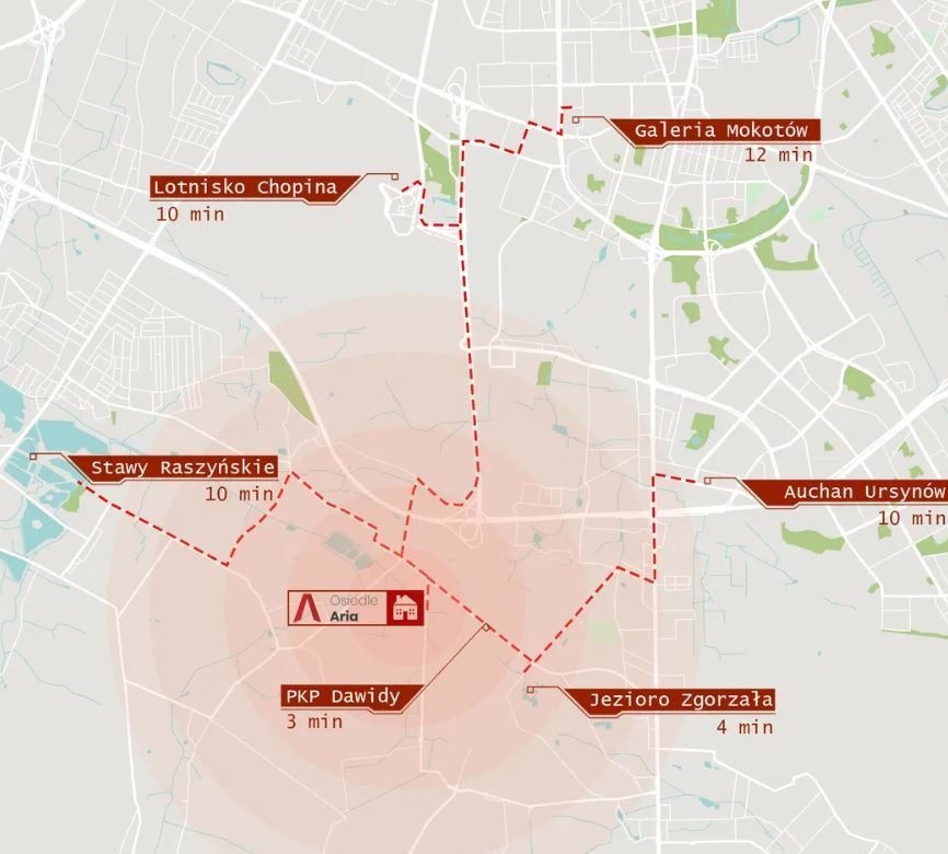 W okolicy: żłobek (500 m), przedszkole (2,5 km), szkoła podstawowa (3,0 km), Galeria Ursynów (10 km), Galeria Janki (9 km), Las Kabacki (4,5 km), przystanek autobusowy z linią 715, 809 (200 m), stacja PKP Dawidy Bankowe (1,5 km).
