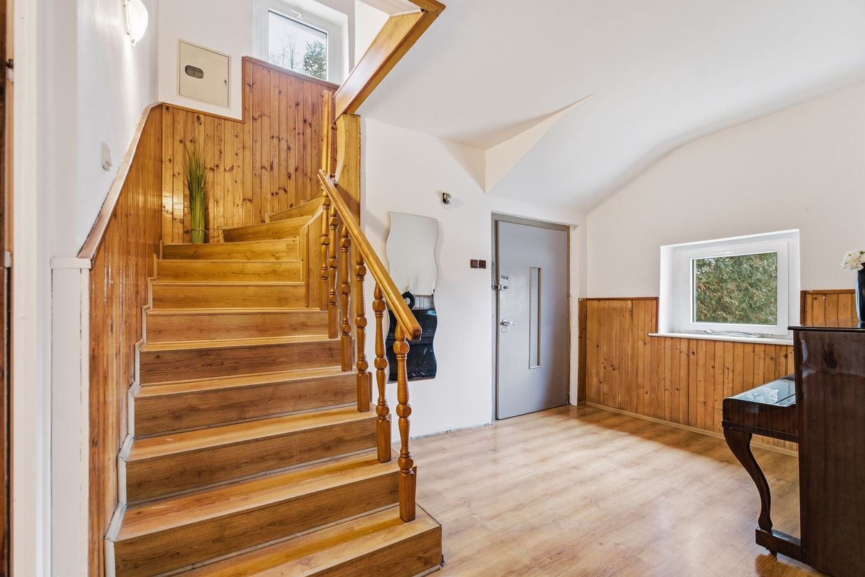 Na piętro prowadzą klasyczne, drewniane schody, nadające wnętrzu charakteru.