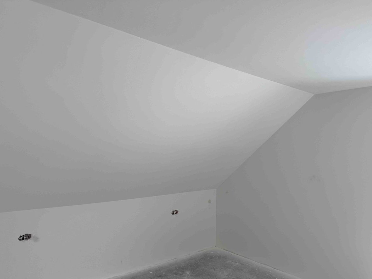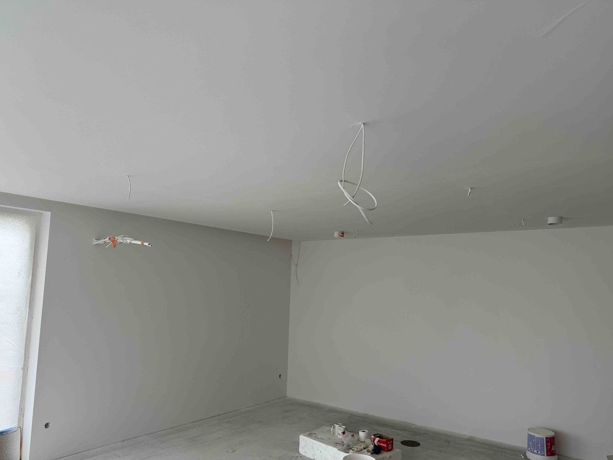 - Ściany wykończone tynkiem cementowym , sufity płytą karton-gips.