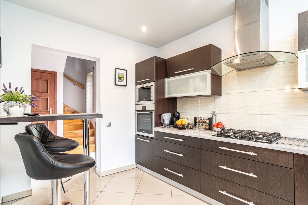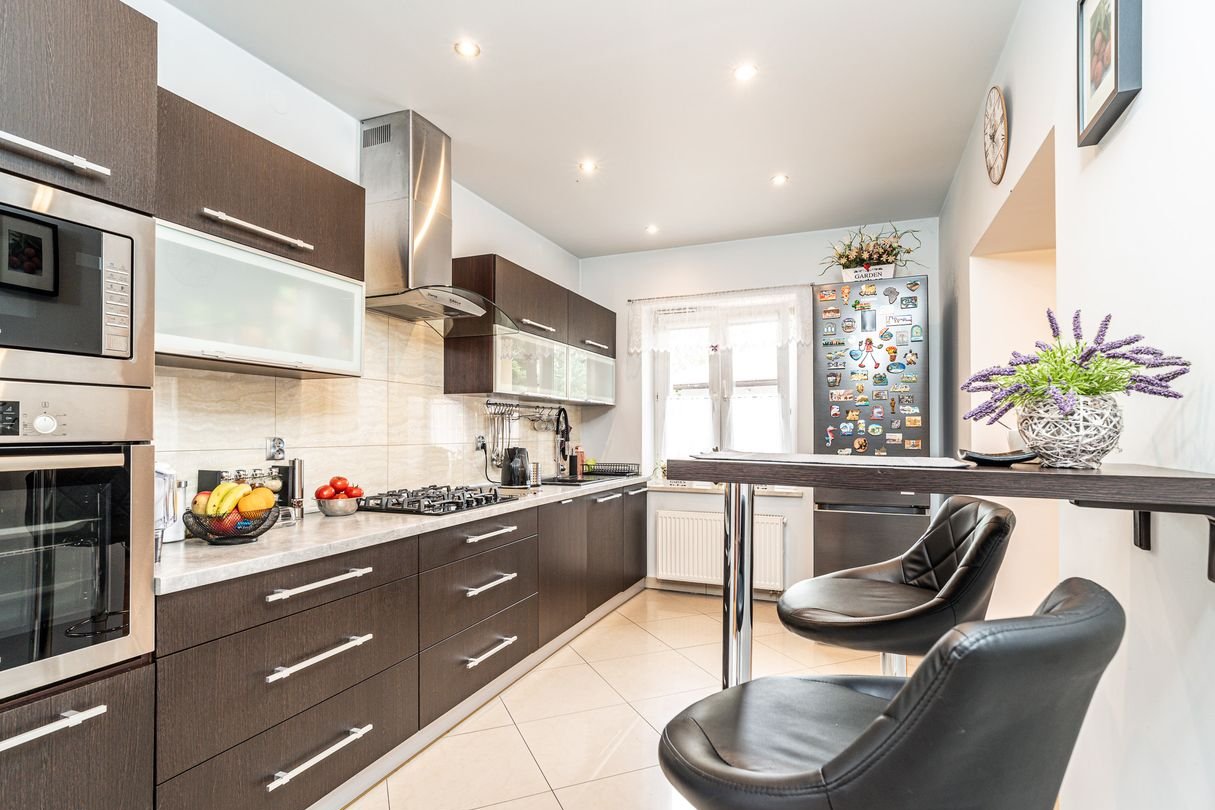 Kuchnia z meblami w zabudowie i sprzętem AGD