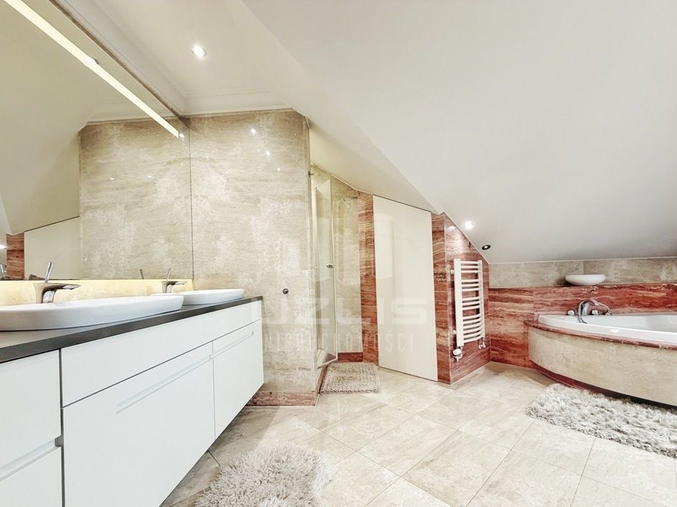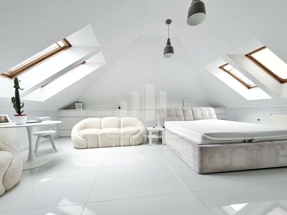 Na piętro prowadzą schody pokryte granitem, poręcze drewniane wykonane na indywidualne zamówienie. Składa się z 4 pokoi, łazienki oraz przestronnego przedpokoju z wyjściem taras. Sypialnia główna posiada garderobę oraz taras z widokiem na ogród. W dwóch pokojach na podłodze płytki ceramiczne wraz z OGRZEWANIEM PODŁOGOWYM, w pozostałych pokojach i przedpokoju na podłodze deska, w łazience wanna oraz prysznic, dodatkowo ogrzewanie podłogowe. Całość wnętrza wykonana z wysokiej klasy materiałów wykończeniowych.